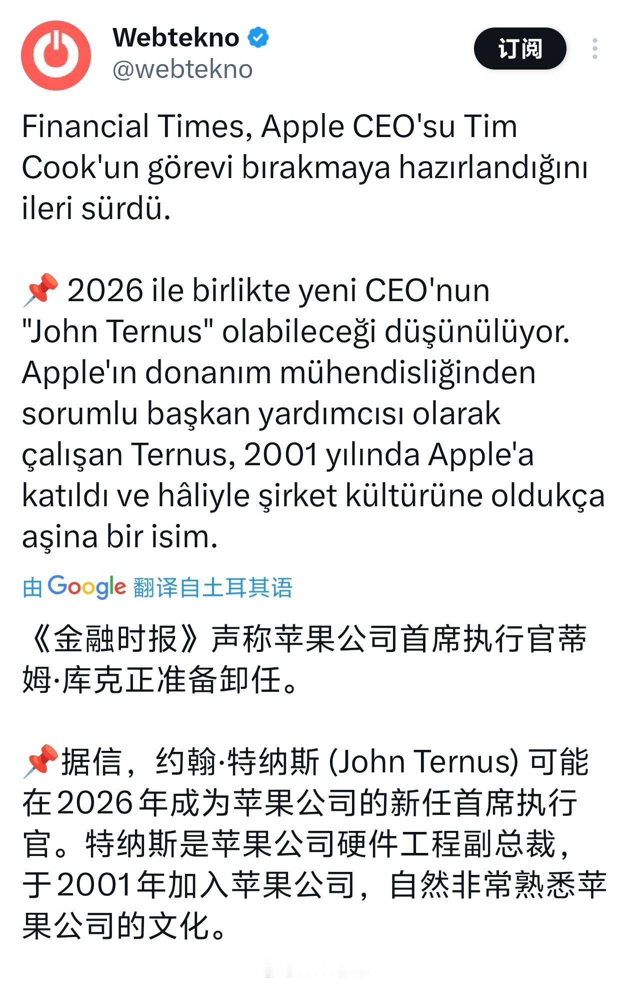 库克准备退休了,苹果硬件工程副总裁约翰·特纳斯可能在明年接替 CEO 职位,也是老员工了,2001 年加入苹果,看他上位能不能搞点大动作,比如 iPhone 20?