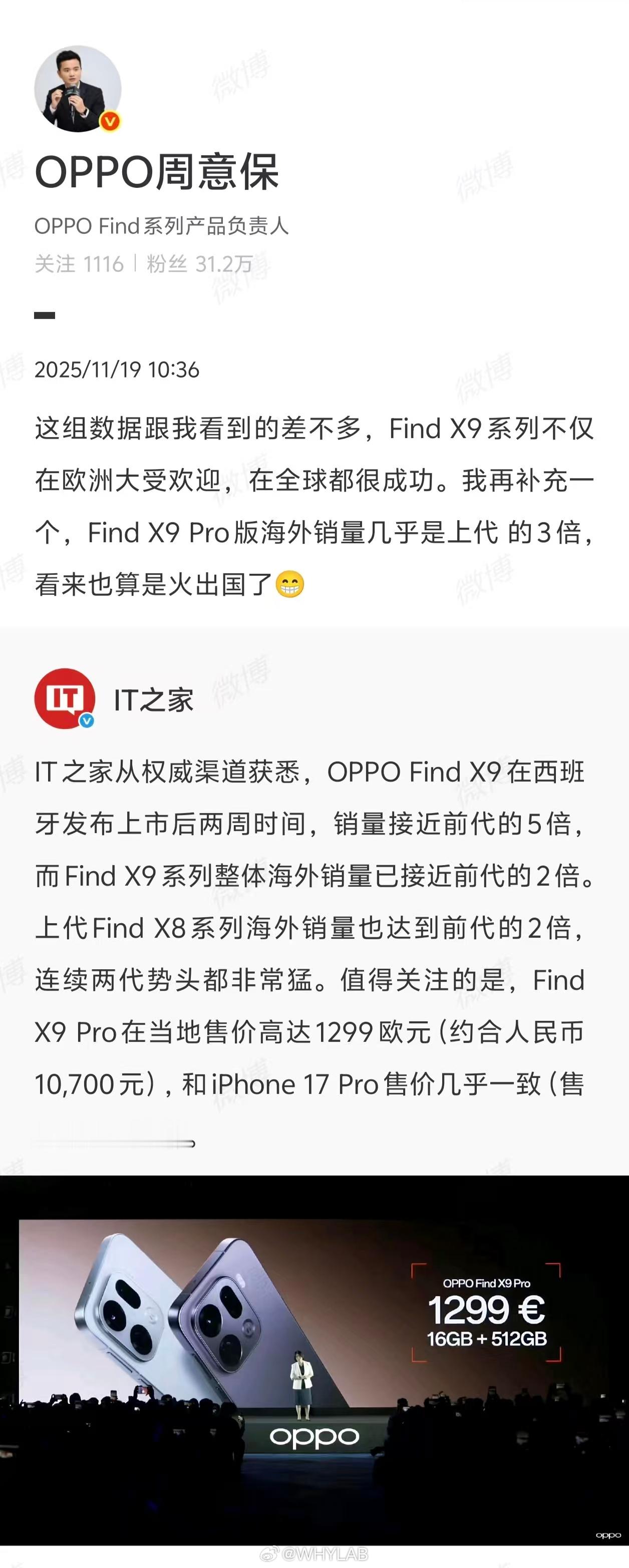 OPPO Find X9 Pro 在海外的价格跟 iPhone 17 Pro 一个级别,1299 欧元,折合人民币超 1 万了,但销量几乎是上代的 3 倍,真火出国了。