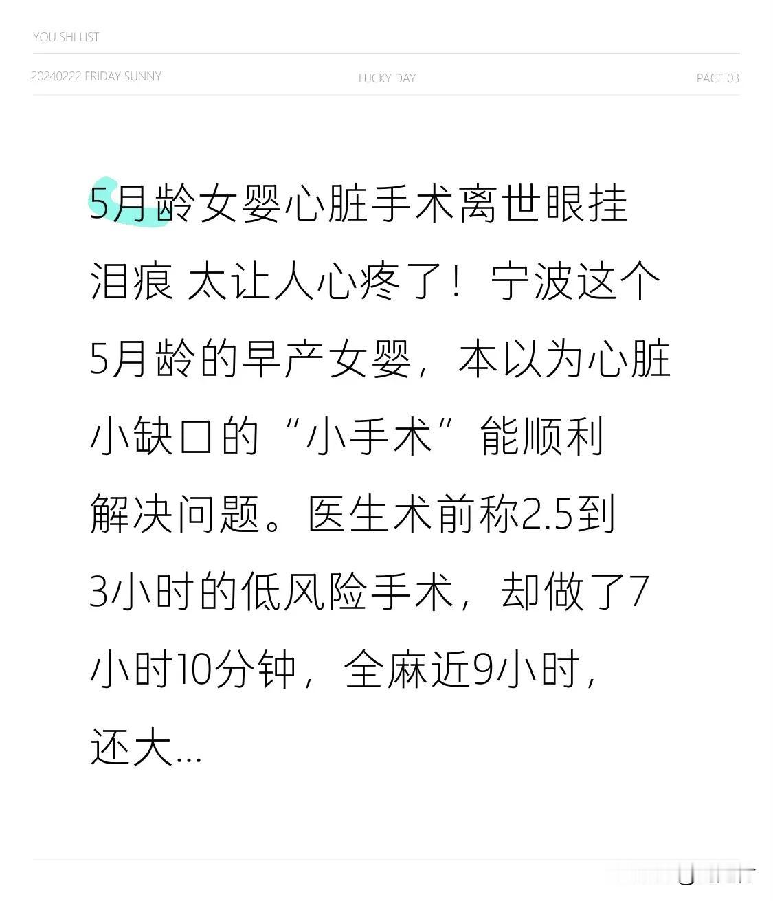 5月龄女婴心脏手术离世眼挂泪痕 5月龄女婴心脏手术后离世,眼角挂着泪痕,令人心疼不已。宁波这名早产女婴,本以为心脏小缺口的“小手术”能顺利解决问题。术前医生称这是一场2.5到3小时的低风险手术,实际却耗时7小时10分钟,女婴全麻近9小时,还因大出血抢救无效离世,离世时眼角挂着泪。 家属表示,术前未被告知病情可能自愈,术中情况也未及时传达,术后医生还称“手术成功”。目前涉事医生停诊,卫健委介入调查。这起事件疑点重重,希望能彻查,给悲痛的家属一个公正交代,给大众一个真相,避免类似悲剧再次发生。5月龄的孩子进行心脏手术,她本就早产、先天不足,即便已五个月,为何不等长大些再手术呢?医疗工作者哪怕只有百分之一的失误,都可能造成悲剧! 儿童医院悲剧 新生儿离世 女童手术离世 手术后死亡