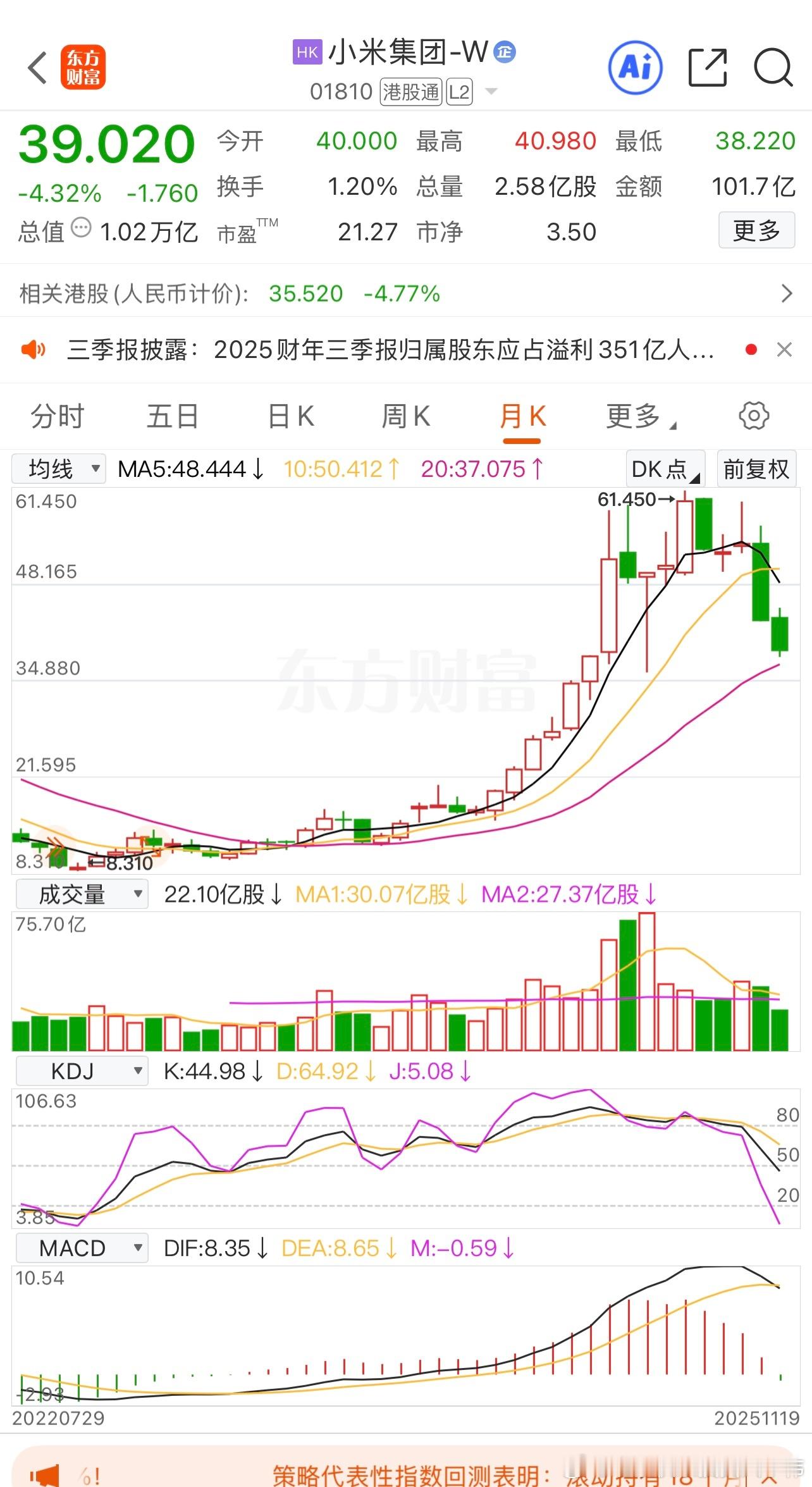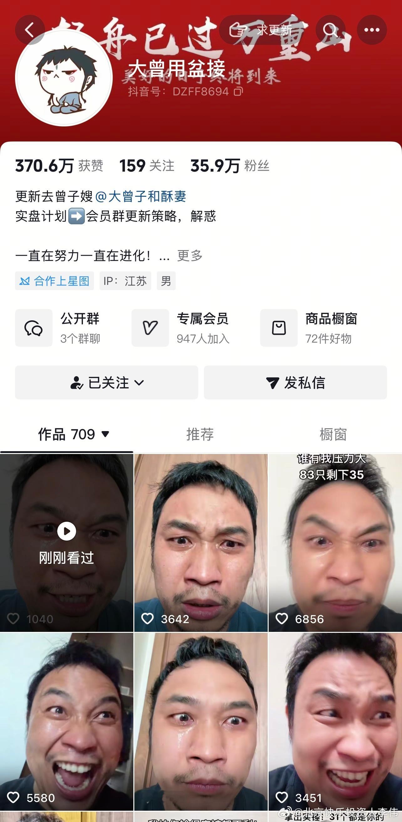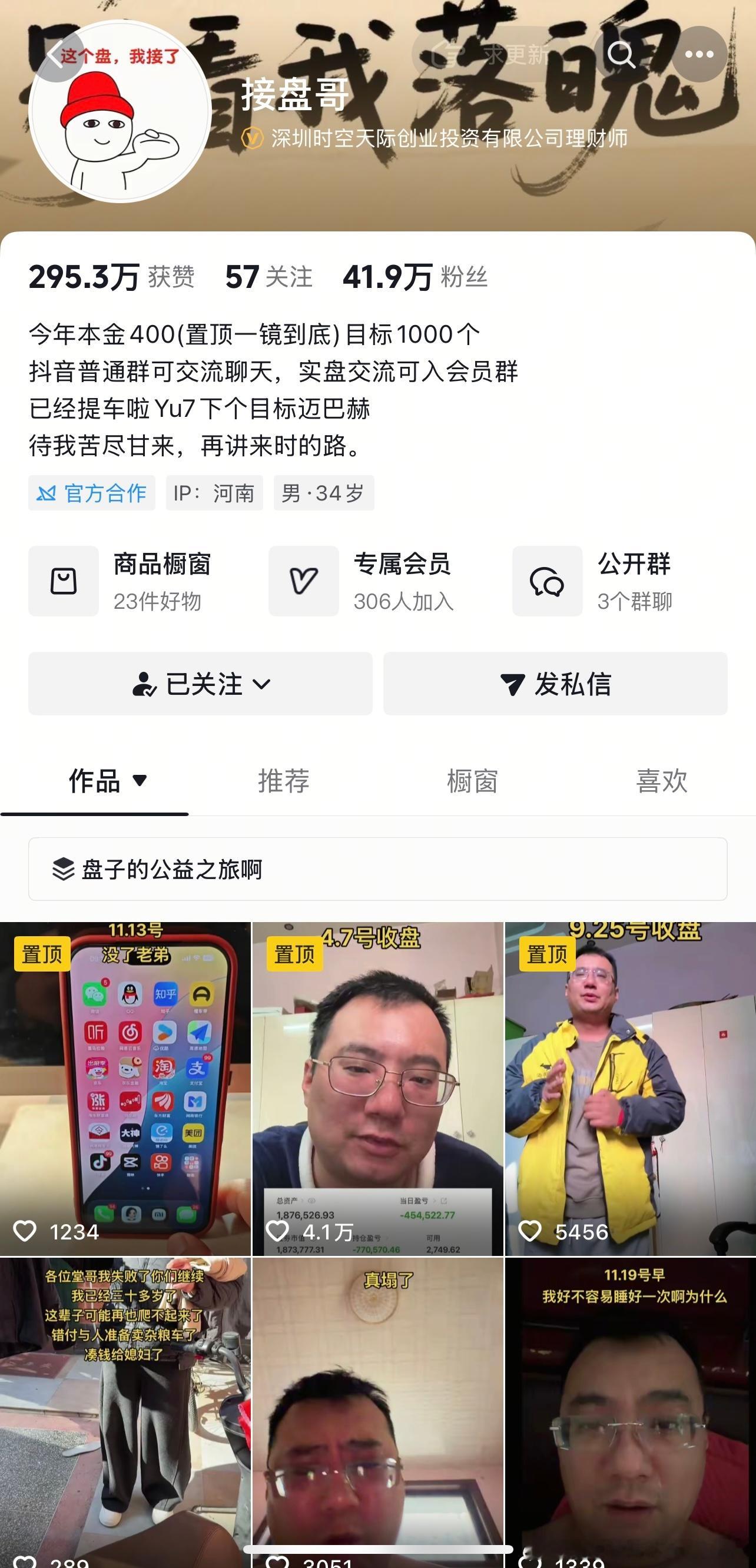 还有谁? 阴跌绞肉机行情,专治各种不服,无论是龙头战法、价值投资、题材炒作一律被收拾,伸手就被捉,买入就是套! 我经常看的抖音财经网红,接盘哥,粉丝41.9万,曾经浮赢又买小米汽车又买小米手机!今天亏186980元,成本一再追加一直亏损,高位满仓持有“科技股”小米集团,已经浮亏102万,但是付费会员有306人! 我经常看的抖音财经网红,大曾用盆接,粉丝35.9万,今天再亏2.55%,83万原始成本还剩34万,赚一天亏2天,但是付费会员有947人,他还有小号付费会员229人,人家明显巨亏,盈利模式极不稳定,居然这么多人购买会员! 当然,我今天一样亏,倾巢之下岂有完卵?我只是想提醒大家持股赚钱不容易,不要幻想和意淫,我炒了这么多年也没有暴富,陈小群、92科比、章盟主都是万里挑一! 行情转弱不要蛮干,跌破了60日线的持股一律只卖不买,走弱的持股一律只卖不买,大涨、急涨一律越涨越卖,认清现实!北京快乐投资人李伟 原创