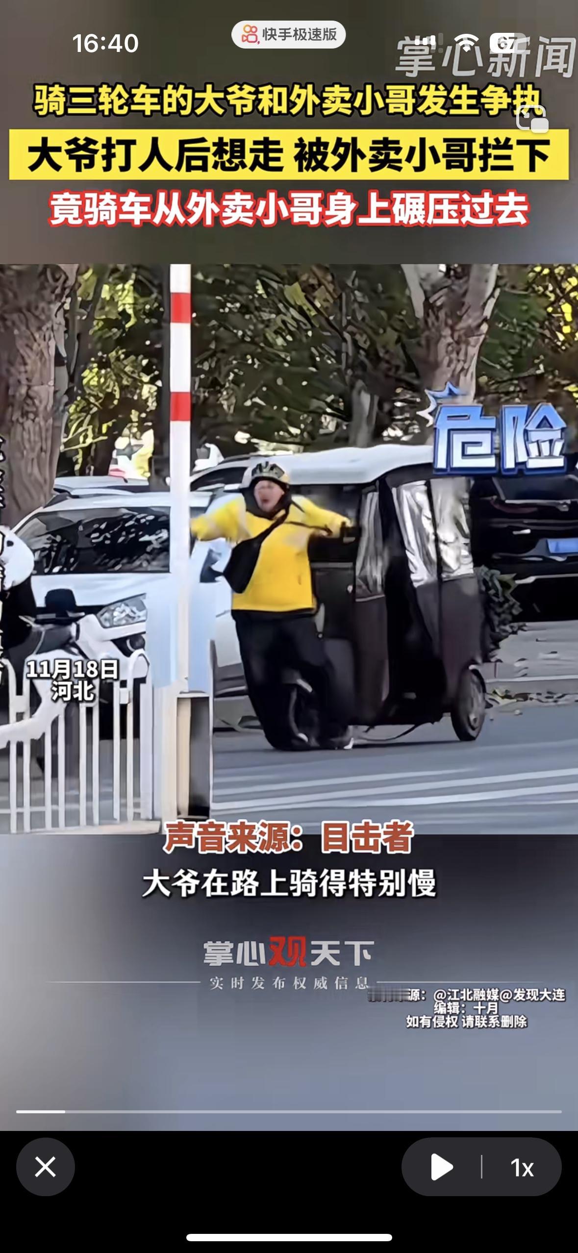 真是无法无天了!老人就可以为所欲为,为非作歹吗? 骑着三轮车的大爷从外卖员后面直接把他撞倒碾压外卖员身体过去,不仅如此还骂人家外卖员,骂了就要走,还给了外卖员几脚 70岁的老人不用进去就这么无法无天吗?年龄不是挡箭牌,不然就取消老头乐,不能这么为非作歹的欺负人