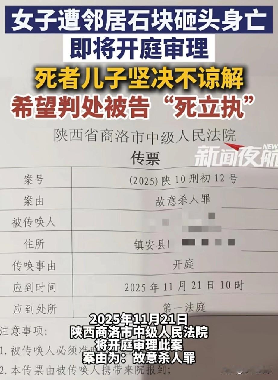 被邻居用石块砸头身亡的女子已丧夫14年,她和儿媳关系很好,有两个可爱的孙子。没想到就因修排水沟纠纷,邻居暴起、痛下杀手,儿子悲痛欲绝,只希望凶手能够判死刑! 2025年5月18日早上,魏万芳儿子突然接到亲戚打来的电话,对方称母亲在老家被人打了,浑身是血,让他赶快回家。 魏万芳的老家在陕西镇安,14年前丈夫去世,好不容易将儿子拉扯大,参加工作并娶妻生子,她平时也就和儿子共同生活在省会西安,偶尔回老家干些农活。 怀着忐忑的心情赶到家,儿子最不想看到的一幕还是发生了:整个院子围上了警戒线,魏万芳躺在地上,已经去世。 原来就在那天早上,邻居张某想紧贴着魏万芳家的房子修排水沟,她不同意,二人起了争执,对方一怒之下,用石块将魏万芳砸头致死。 从现场图来看,邻居想修排水沟的位置,的确不太妥当,如此靠近魏家的楼房,需要开挖又常年湿润,势必会对房屋地基产生影响。 不过如果那处是邻居私有,并非公共,魏家修房屋没有留出足够余地,邻居想修沟,魏家也就没有理由去阻拦了。 但不管怎样,有纠纷可以心平气和去协商,像邻居这样暴怒杀人,必然会付出沉重的法律代价。 事发后,张某因涉嫌故意杀人被刑拘,此案将于11月21日在商洛中院开庭审理,案由是故意杀人罪。 《刑法》第232条,故意杀人的,处死刑、无期徒刑或10年以上有期徒刑。 儿子对母亲的突然死亡痛不欲生,发誓要为母亲讨回公道,坚决不谅解邻居,希望对方最终能判死立执! 据儿子自己描述,他18岁丧父,如今32岁事业刚稳定又丧母,子欲养而亲不待,这份打击实在是太大了。 再看魏万芳自己,丈夫过世14年,儿子大学毕业、娶妻生子,还生下了两个小孩。她性格开朗,和儿媳相处很不错,平时也爱跳跳舞,本该安享下半生,没想到因邻里土地纠纷丢了性命。 在坟前,儿子摆满了母亲爱吃的水果,并告诉她两个孙子都过得很好,一个上一年级、一个上大班。可这些,作为奶奶的她,再也无法亲眼看见。 六尺巷的故事至今流传,邻里之间本该多分容忍,因寸尺土地纠纷闹出人命的新闻屡见不鲜,两个甚至多个家庭因丁点冰冷的沙土而破碎,这真的值吗? 【关注@小讼言案 ,为您分享更多精彩】 (来源:新闻夜航)
