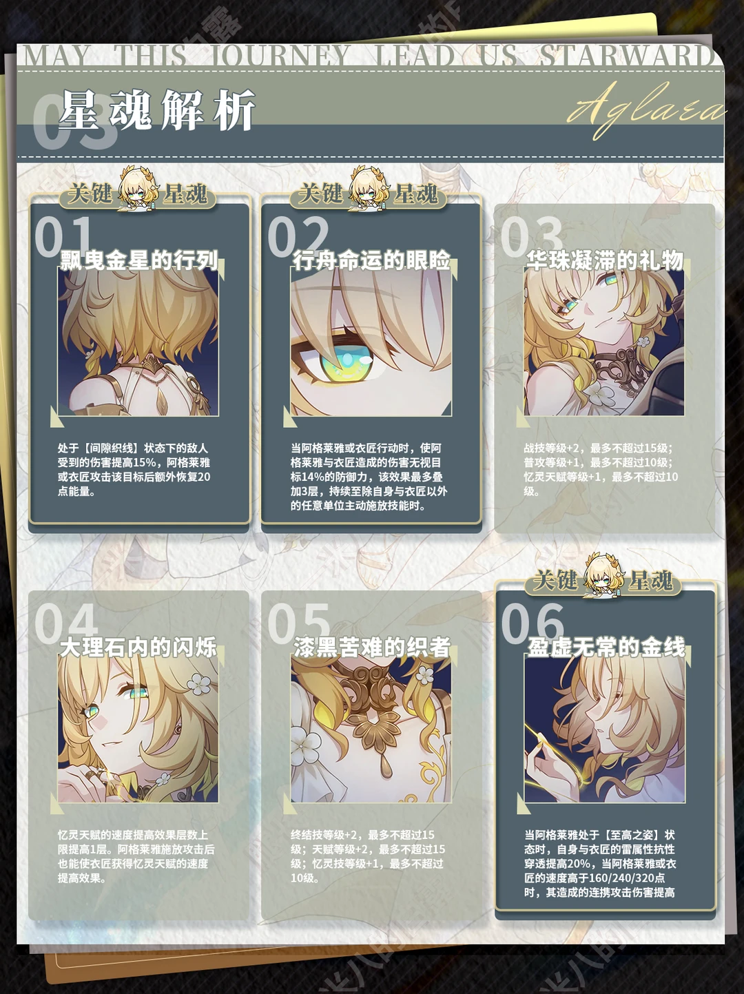 当阿格莱雅处于【至高之姿】状态时,自身与衣匠的雷属性抗性穿透提高20%,当阿格莱雅或衣匠的速度高于160/240/320点时,其造成的连携攻击伤害提高