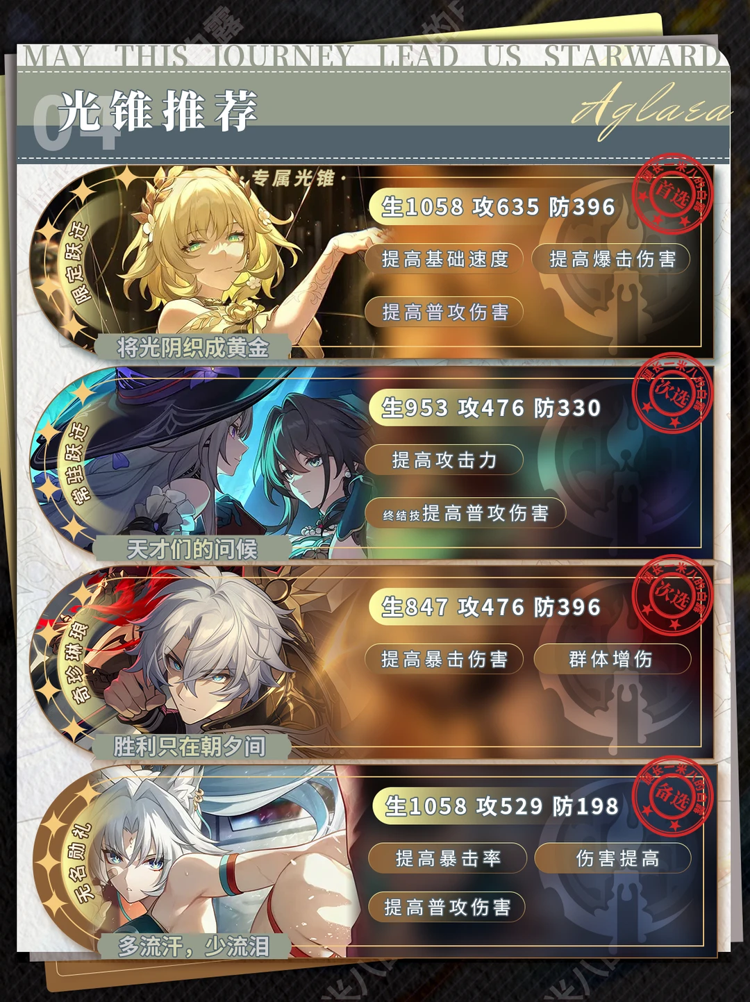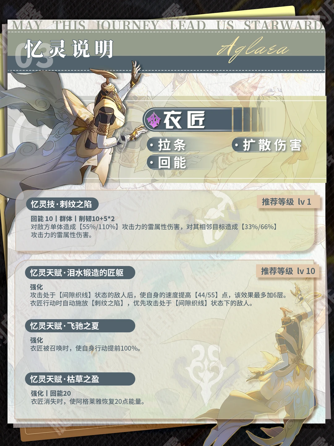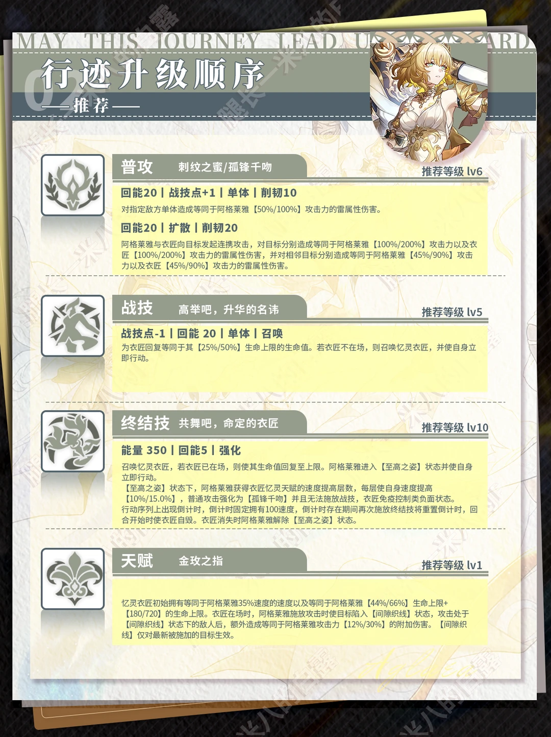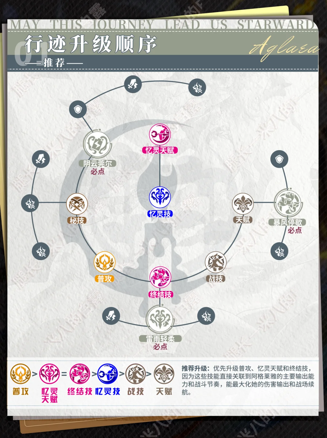 推荐升级:优先升级普攻、忆灵天赋和终结技,因为这些技能直接关联到阿格莱雅的主要输出能力和战斗节奏,能最大化她的伤害输出和战场续航。