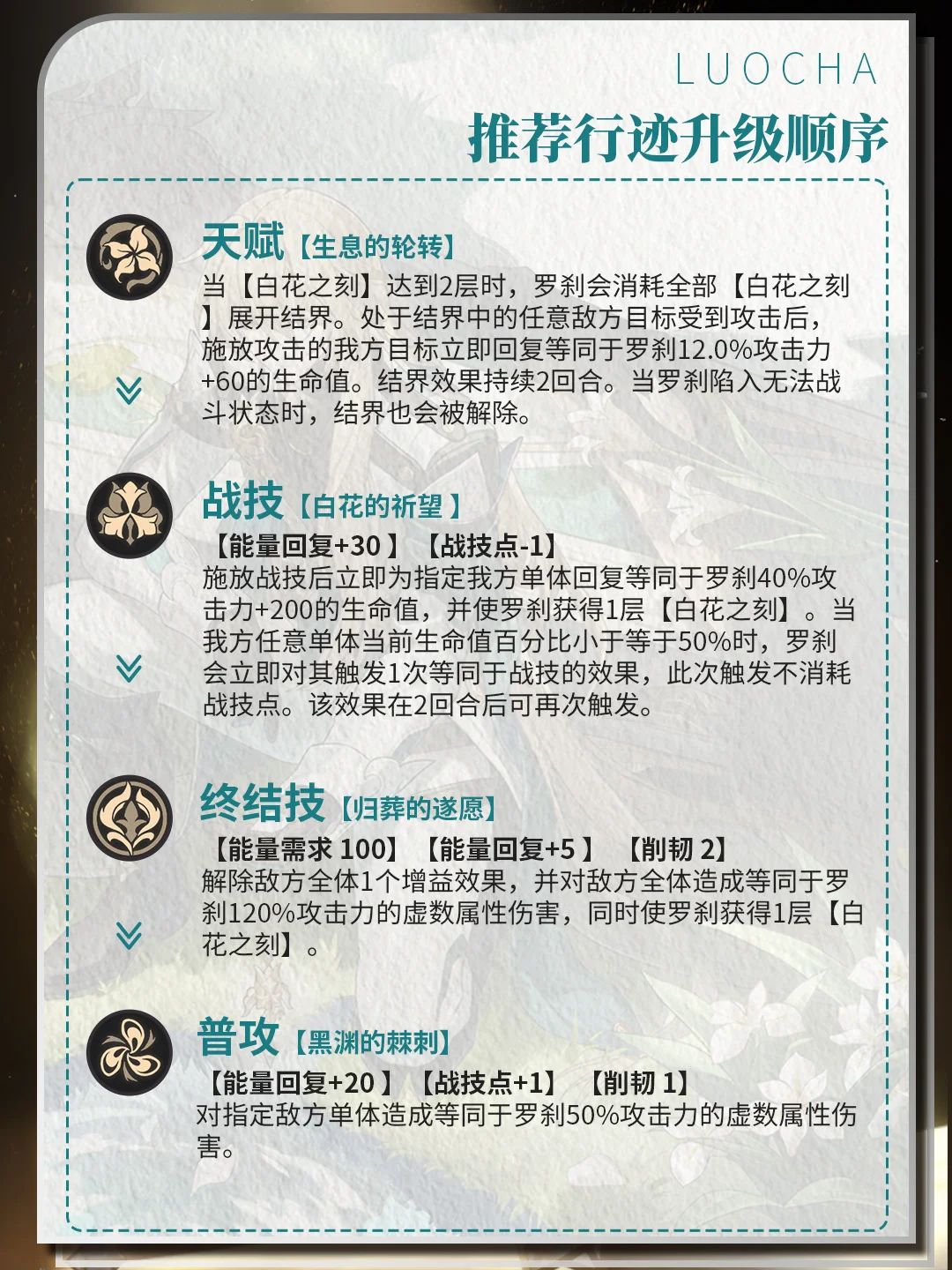【能量需求 100】【能量回复+5】【(削韧 2】解除敌方全体1个增益效果,并对敌方全体造成等同于罗刹120%攻击力的虚数属性伤害,同时使罗刹获得1层【白花之刻】。