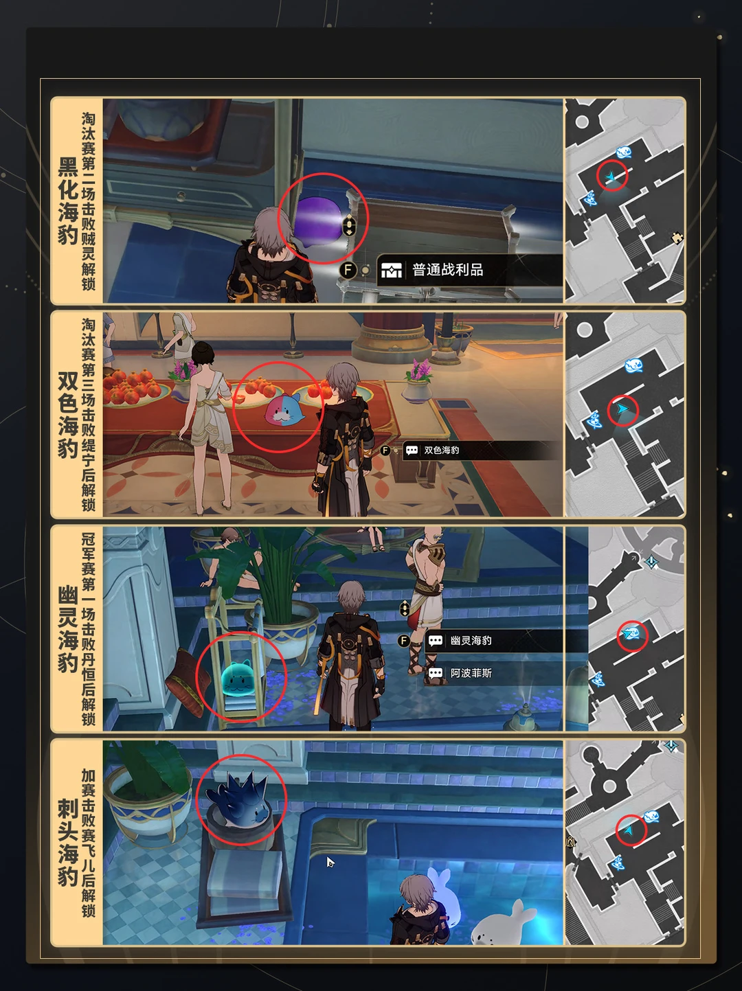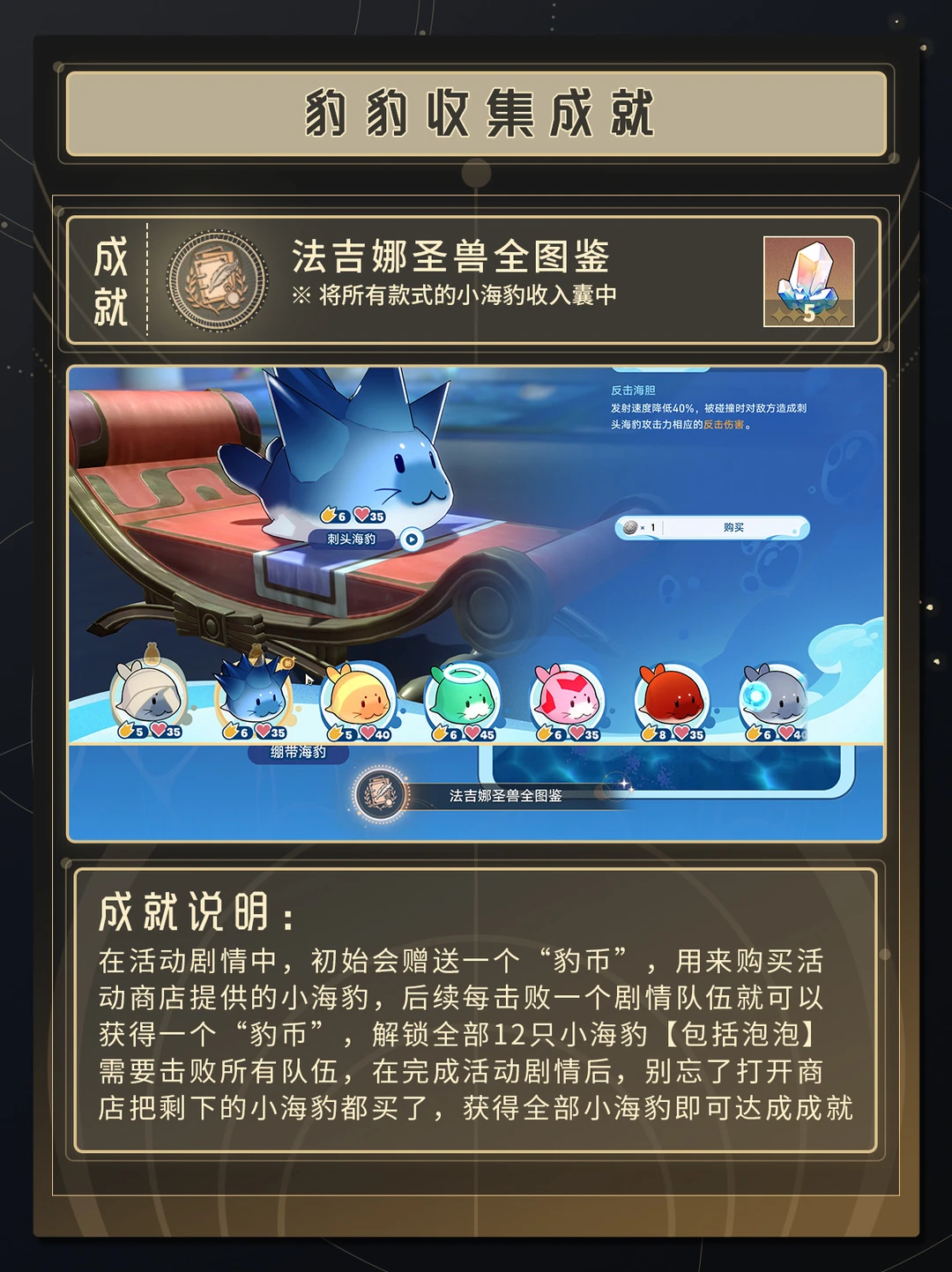 在活动剧情中,初始会赠送一个“豹币”,用来购买活动商店提供的小海豹,后续每击败一个剧情队伍就可以获得一个“豹币”,解锁全部12只小海豹【包括泡泡)需要击败所有队伍,在完成活动剧情后,别忘了打开商店把剩下的小海豹都买了,获得全部小海豹即可达成成就