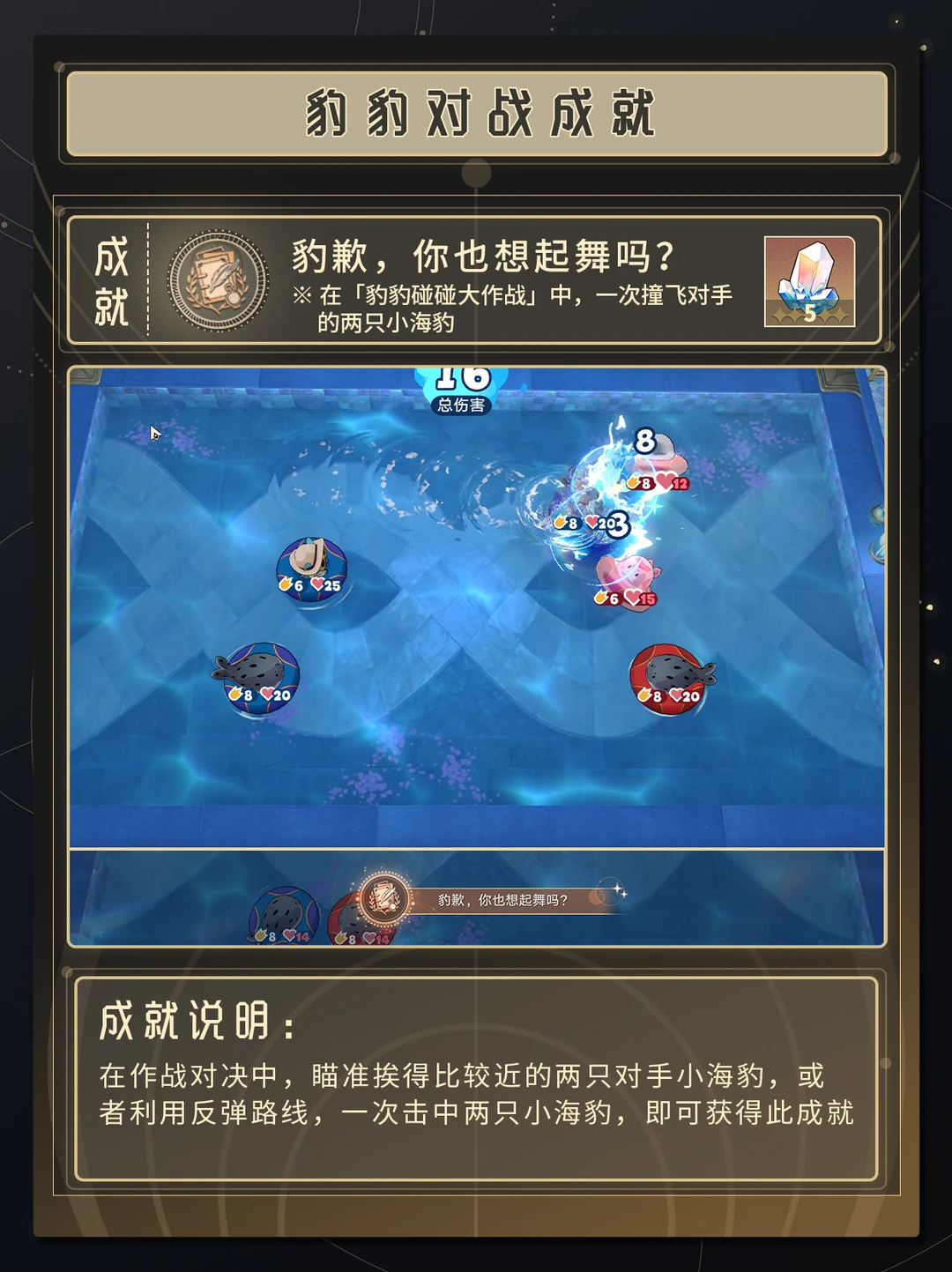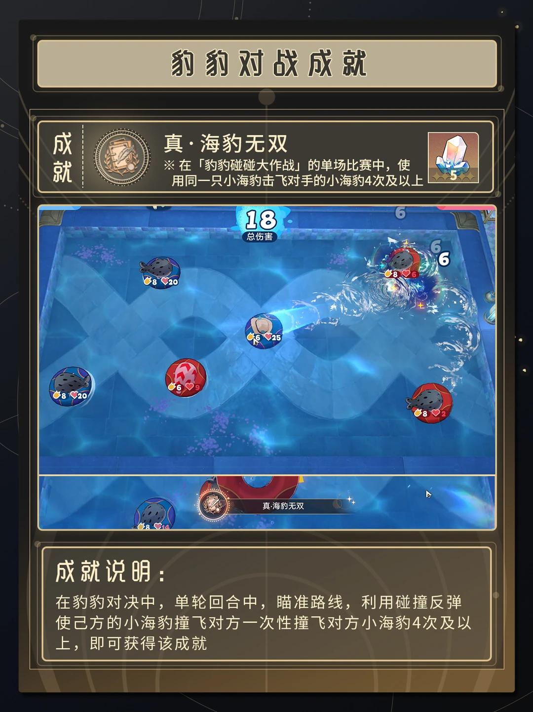 在豹豹对决中,单轮回合中,瞄准路线,利用碰撞反弹使已方的小海豹撞飞对方一次性撞飞对方小海豹4次及以上,即可获得该成就