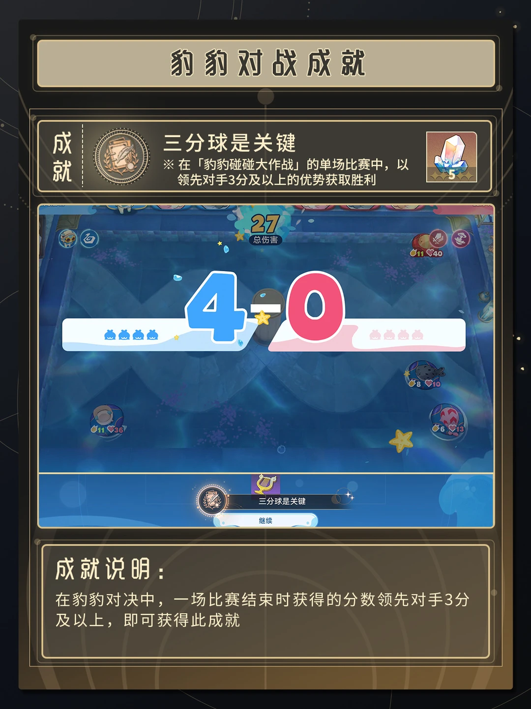 在豹豹对决中,一场比赛结束时获得的分数领先对手3分及以上,即可获得此成就
