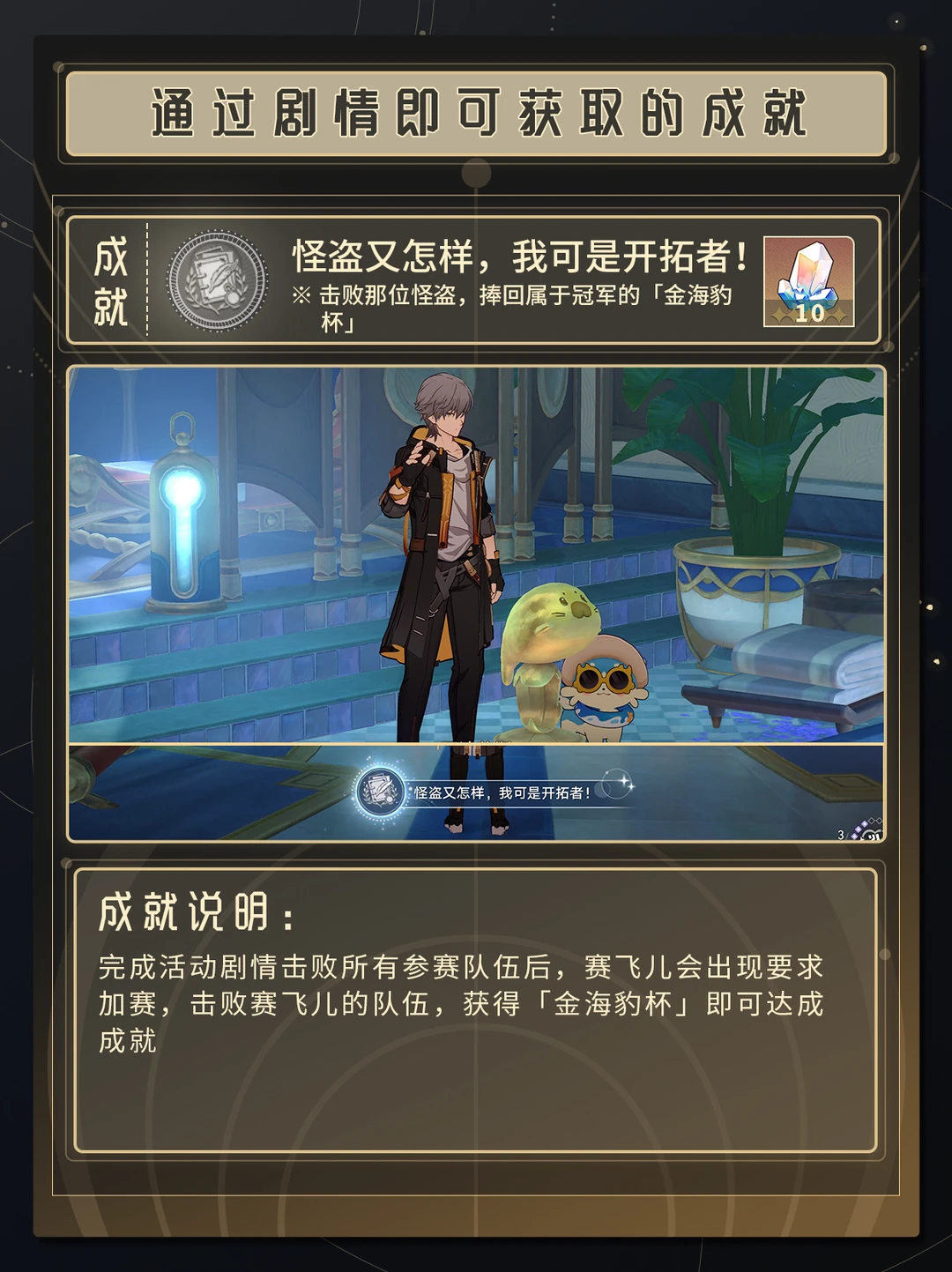 完成活动剧情击败所有参赛队伍后,赛飞儿会出现要求加赛,击败赛飞儿的队伍,获得「金海豹杯」即可达成成就