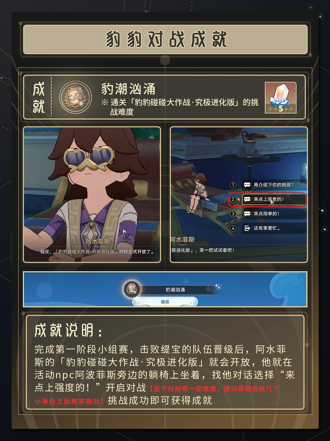 完成第一阶段小组赛,击败缇宝的队伍晋级后,阿水菲斯的「豹豹碰碰大作战:究极进化版」就会开放,他就在活动npc阿波菲斯旁边的躺椅上坐着,找他对话选择“来点上强度的!”开启对战【这个对战有一定难度,建议获取后续几个小海豹之后再来挑战】挑战成功即可获得成就