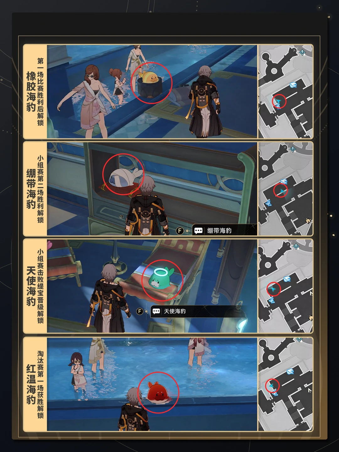和活动场地浴场内所有小海豹对话完成此成就,小海豹是随着活动剧情逐步解锁的,完成所有剧情对决才能解锁所有小海豹,做完活动别忘了都找一下【除了泡泡,一共11只小海豹】