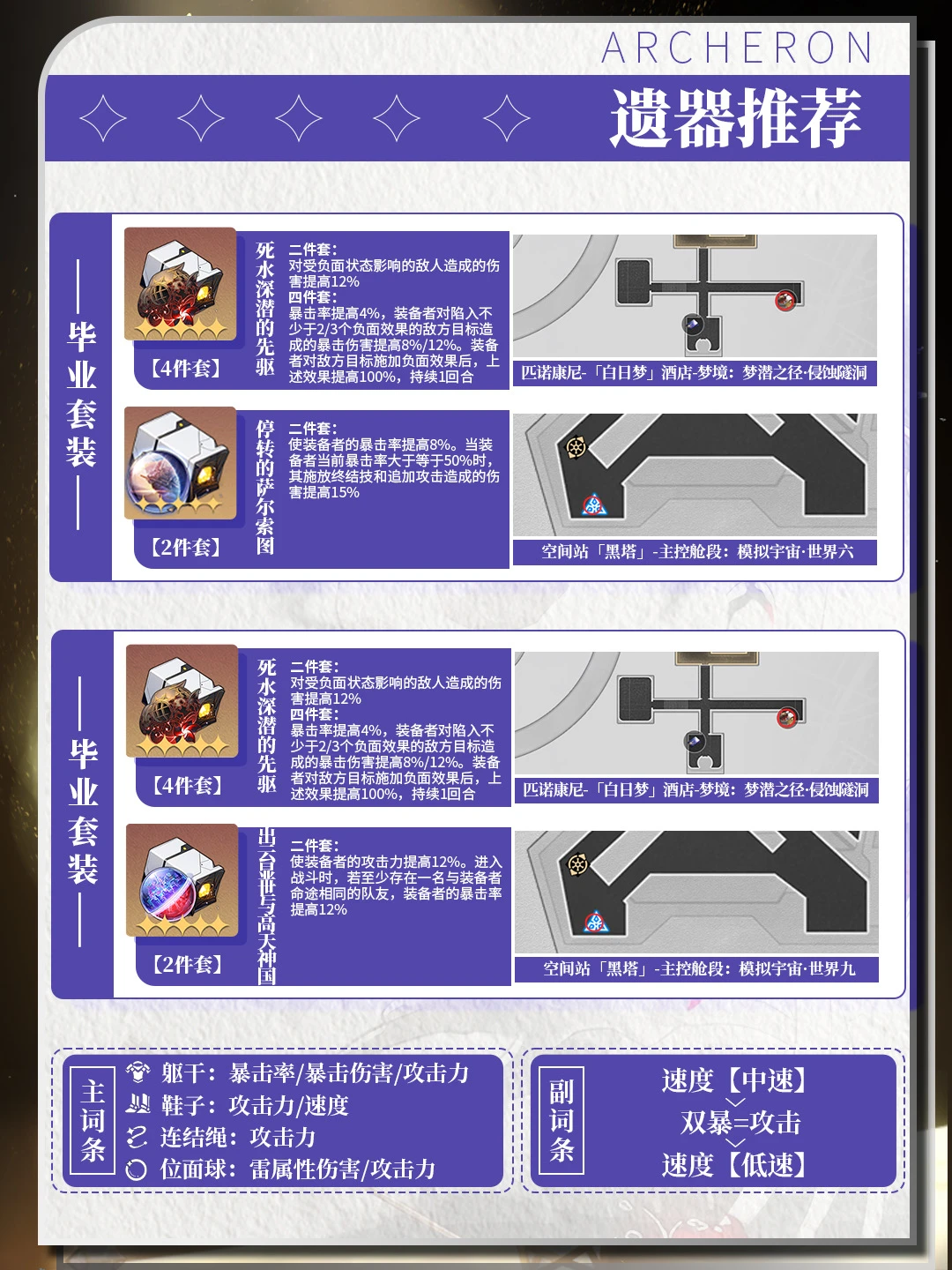 死水深潜的先驱:二件套:对受负面状态影响的敌人造成的伤害提高12%四件套:暴击率提高4%,装备者对陷入不少于2/3个负面效果的敌方目标造成的暴击伤害提高8%/12%。装务者对敌方目标施加负面效果后,上述效果提高100%,持续1回合