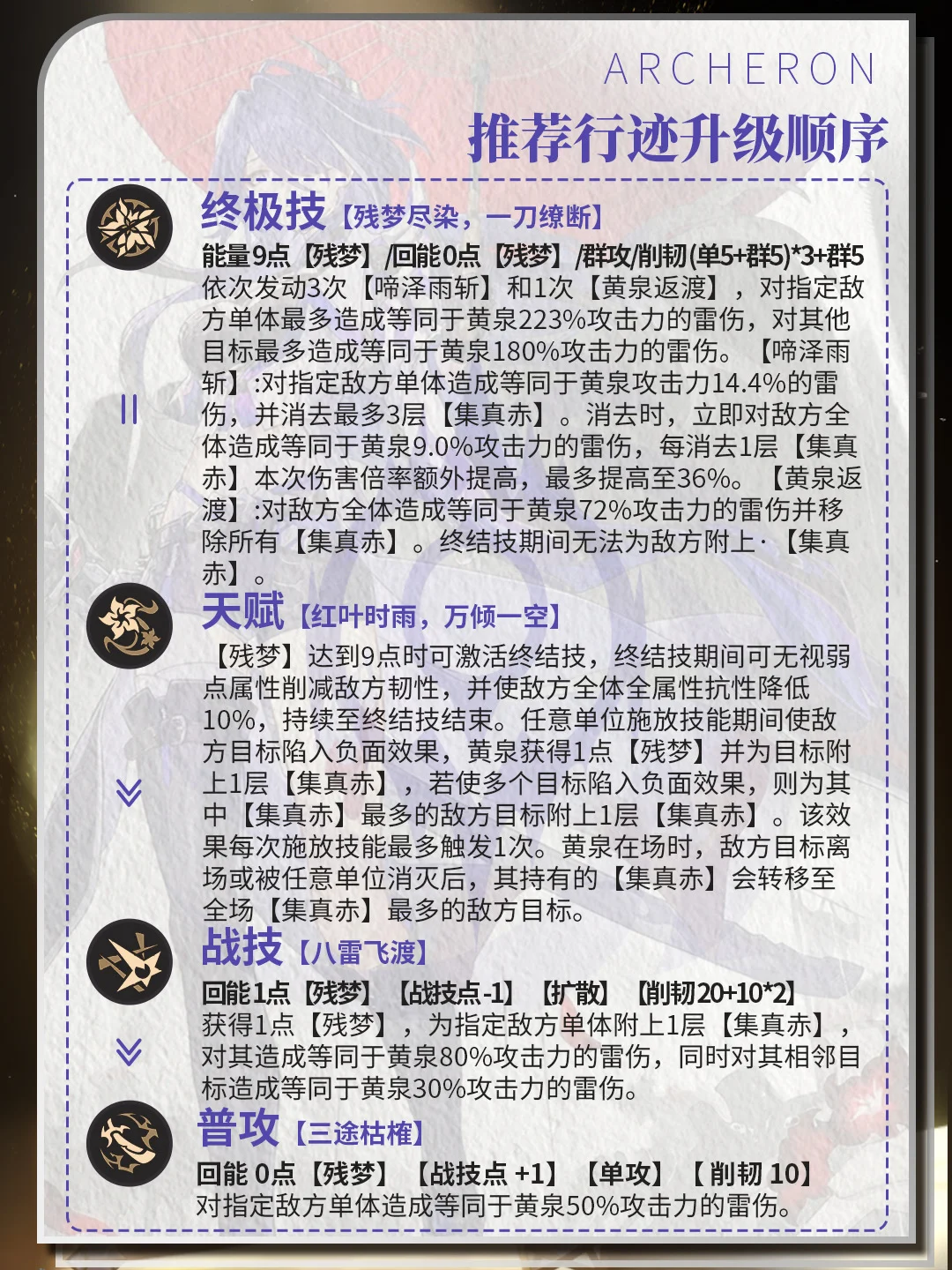 黄泉造成的终结技伤害全属性抗性穿透提高20%,施放普攻、战技造成的伤害同时视为终结技伤害,并无视弱点属性削减敌方韧性。击破弱点时触发雷属性的弱点击破效果。