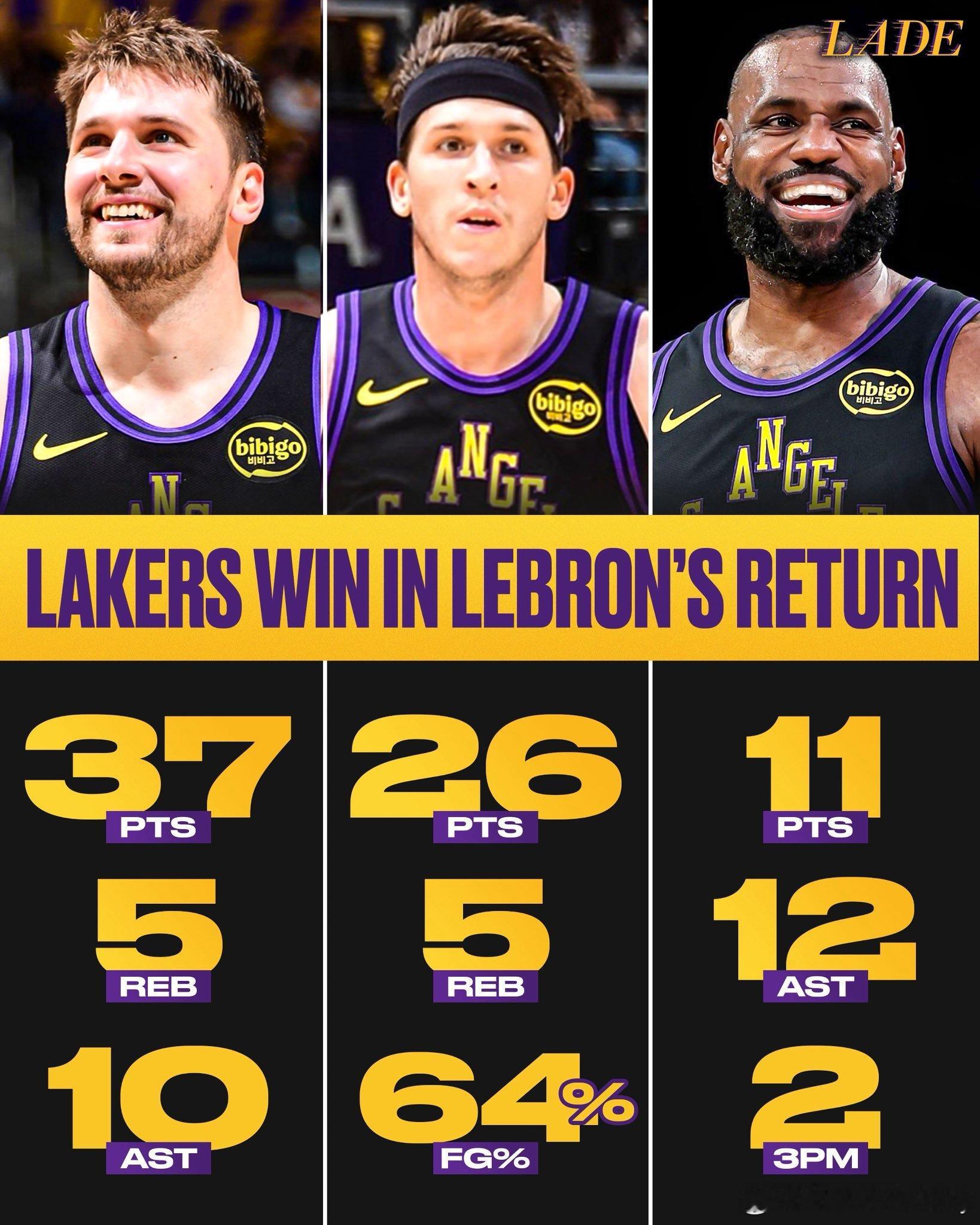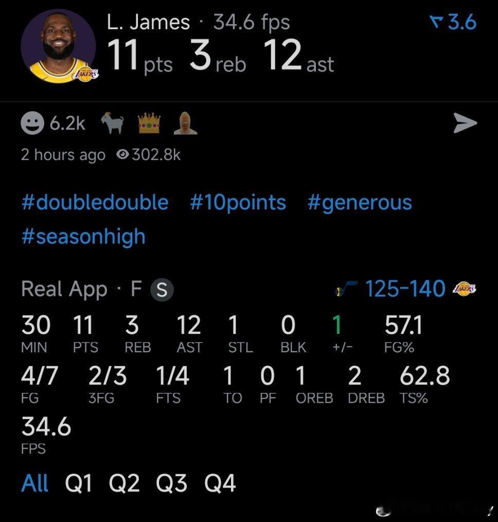 詹姆斯复出首秀,7中4,三分3中2,罚球4中1得到11分3篮板12助攻。正负值+1。