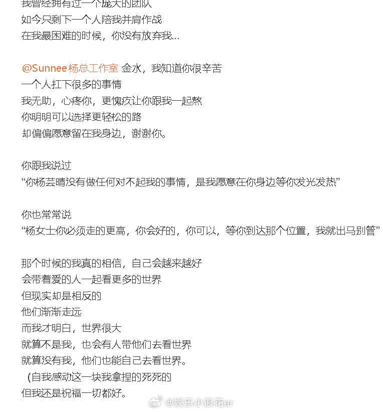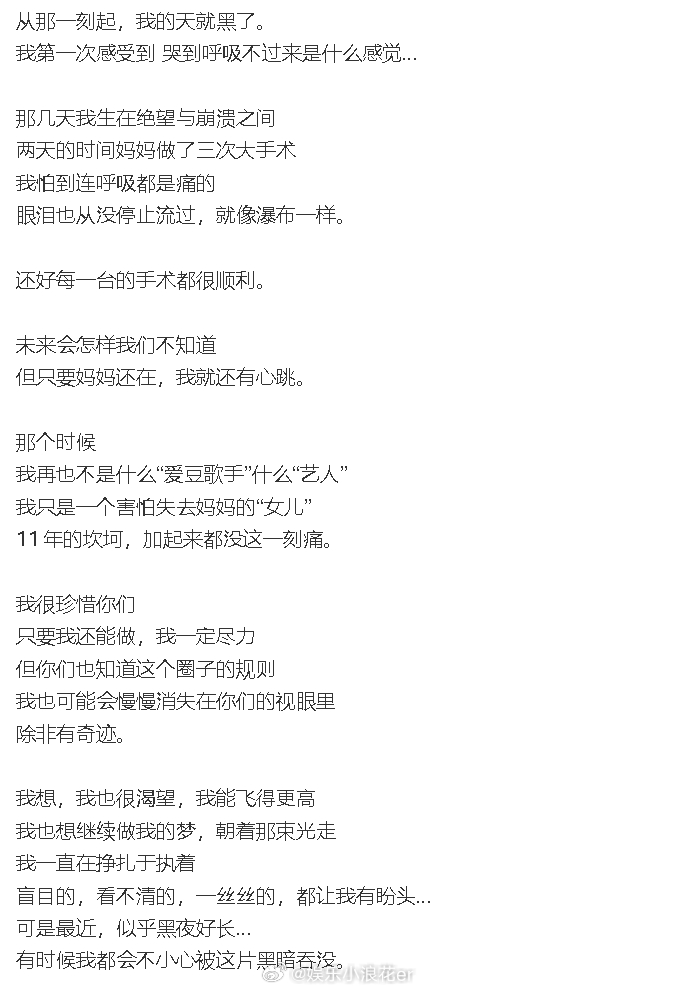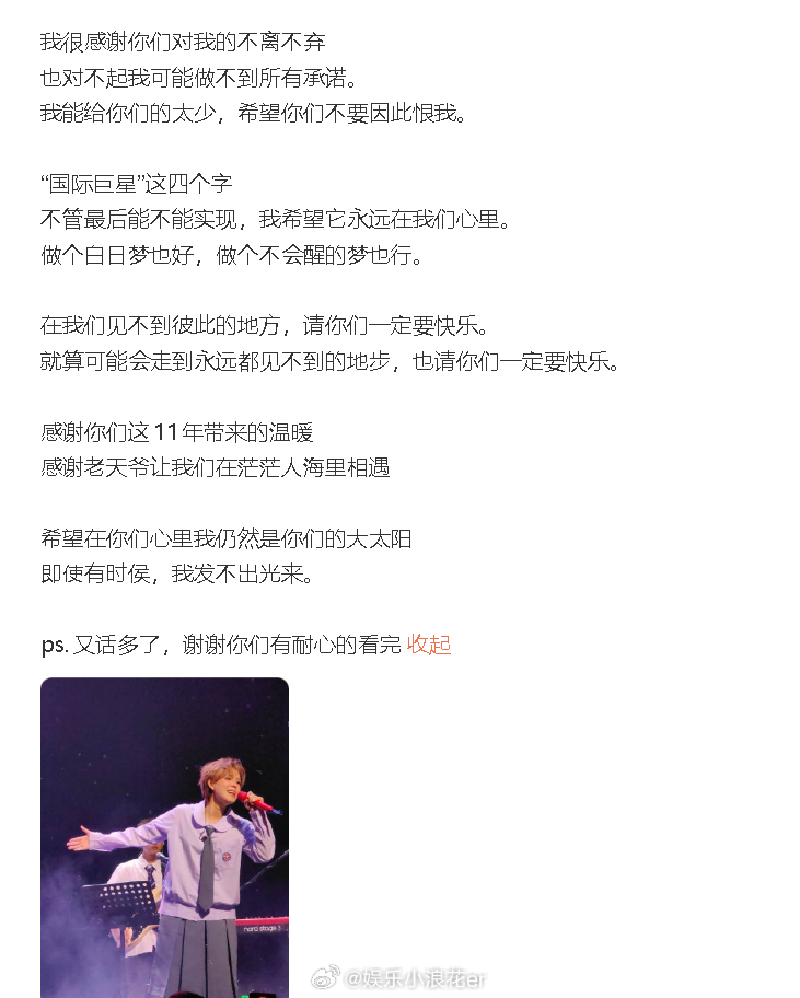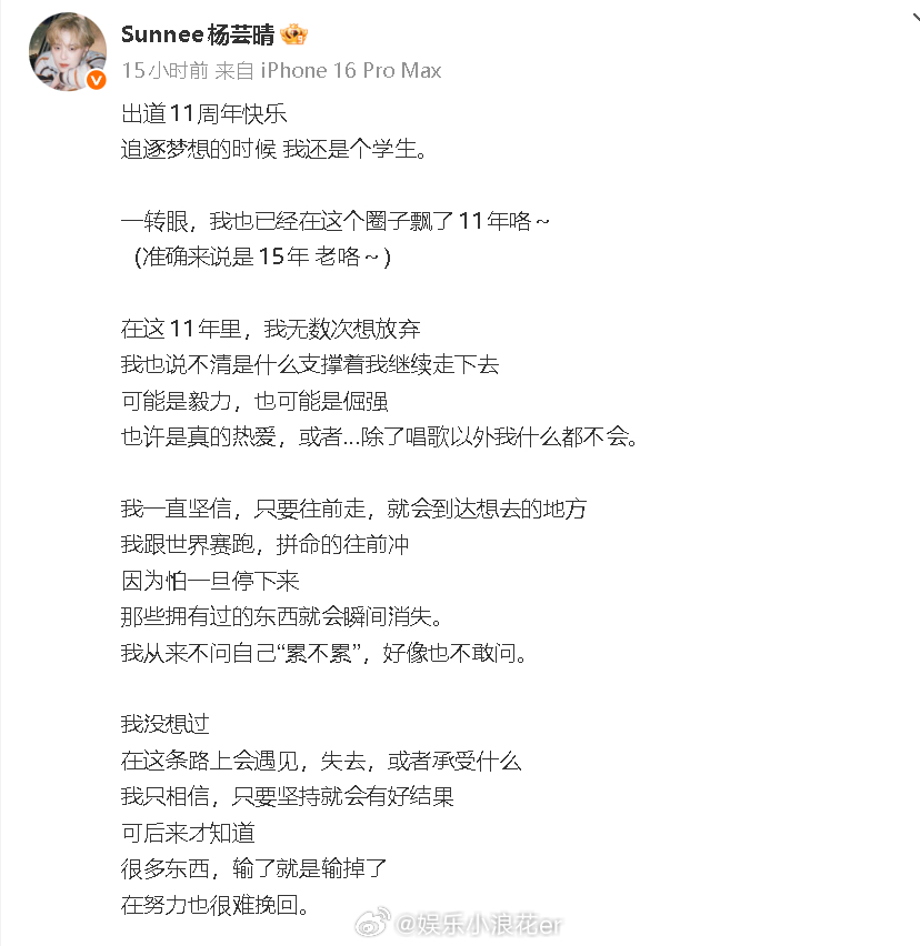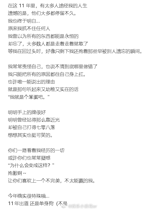 出道11周年发长文,她透露现在工作室只剩下一个人:“明明手上的牌很好,明明曾经站得那么靠近光。却被自己打得七零八落,想想其实也挺可笑的”,“抱歉啊~让你们喜欢上一个不完美,不太能赢的我。”