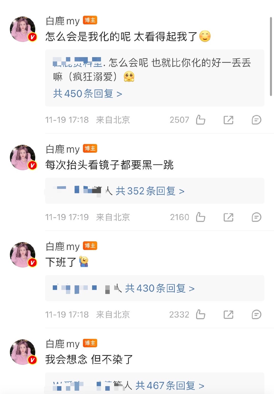 11月19日, 发黑发自拍!并配文:“害”。随后,白鹿又在评论区表示自己每次抬头看镜子都要黑一跳。对于此前的发色,白鹿表示:“我会想念,但不染了。”