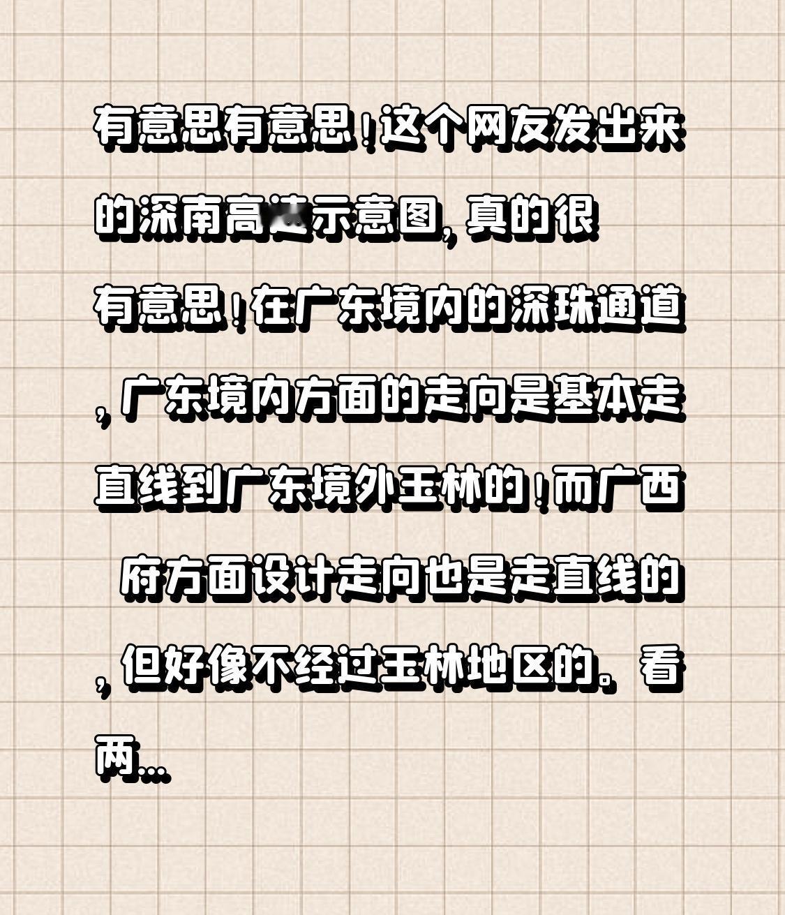 有意思!有意思! 这位网友发布的深南高速示意图,着实有意思! 广东境内的深珠通道,其在广东境内的走向基本是直线延伸至广东境外的玉林。 而广西壮府所设计的走向同样为直线,不过似乎并不途经玉林地区。 由此可见,两广之间所谓的无缝对接实则是存在差异。 这是相互不沟通的结果吗?