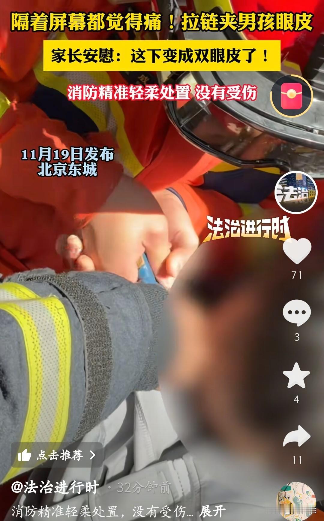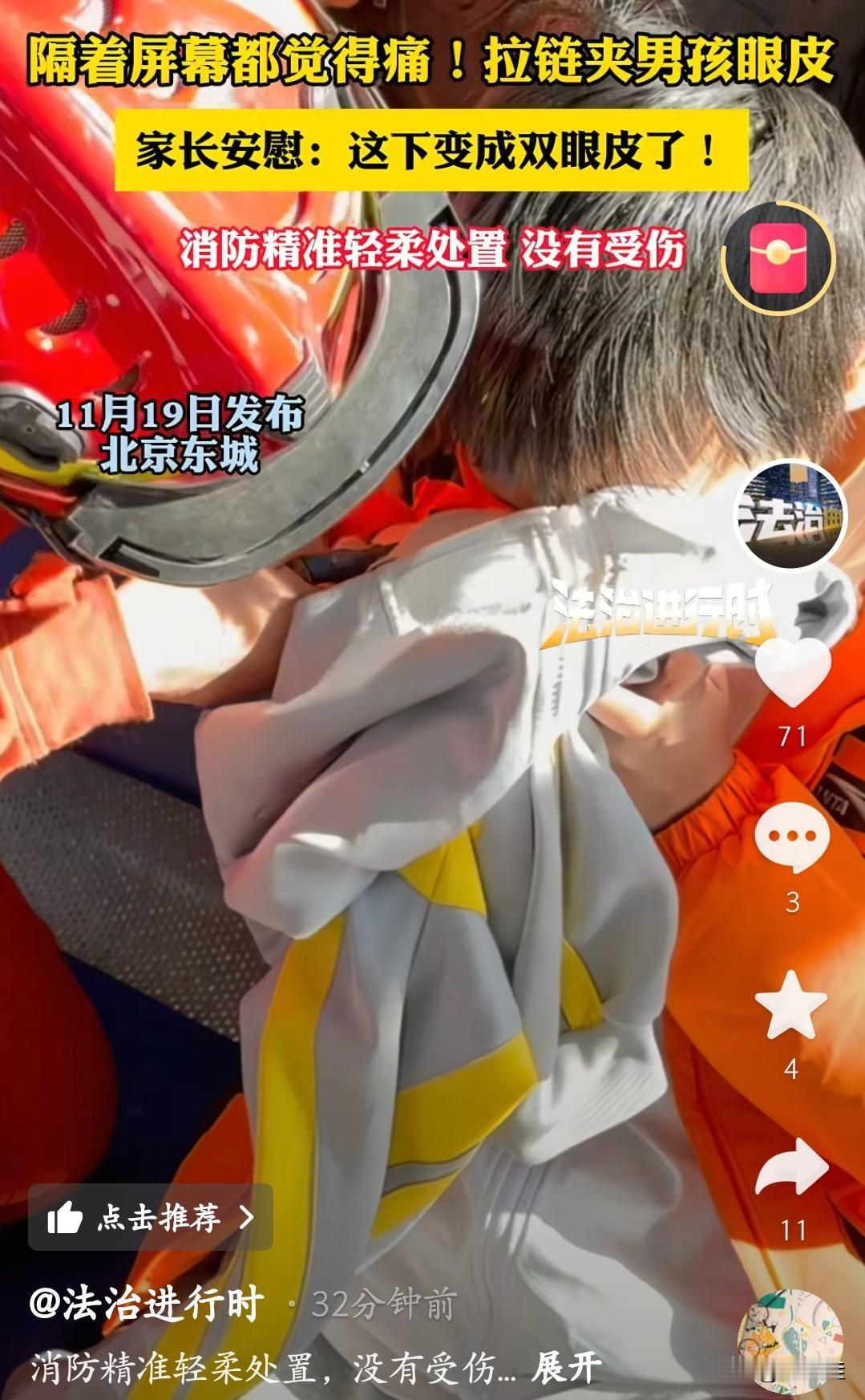 好在消防员来得快,穿橙衣服的蓝朋友拿着工具,手稳得像装了防抖,一点点轻轻撬拉链,大气都不敢喘,生怕碰着娃眼睛。最后愣是精准又轻柔地把眼皮“摘”出来了,娃一点没受伤! 只能说消防员是真厉害,灭得了火、救得了困,连“眼皮卡拉链”这种精细活都能拿捏。这小朋友也算“一战成名”,就是这“成名方式”属实有点疼哈哈。