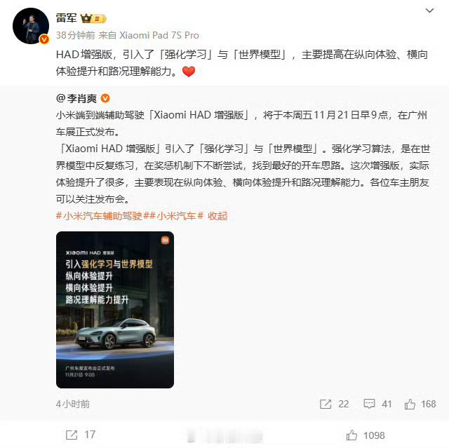 小米发力Ai了,辅助驾驶的短板,未来两年会补齐,造车是长跑,短时间的一些舆论根本影响不了长远的节奏,辅助驾驶升级,关注后面实测效果。