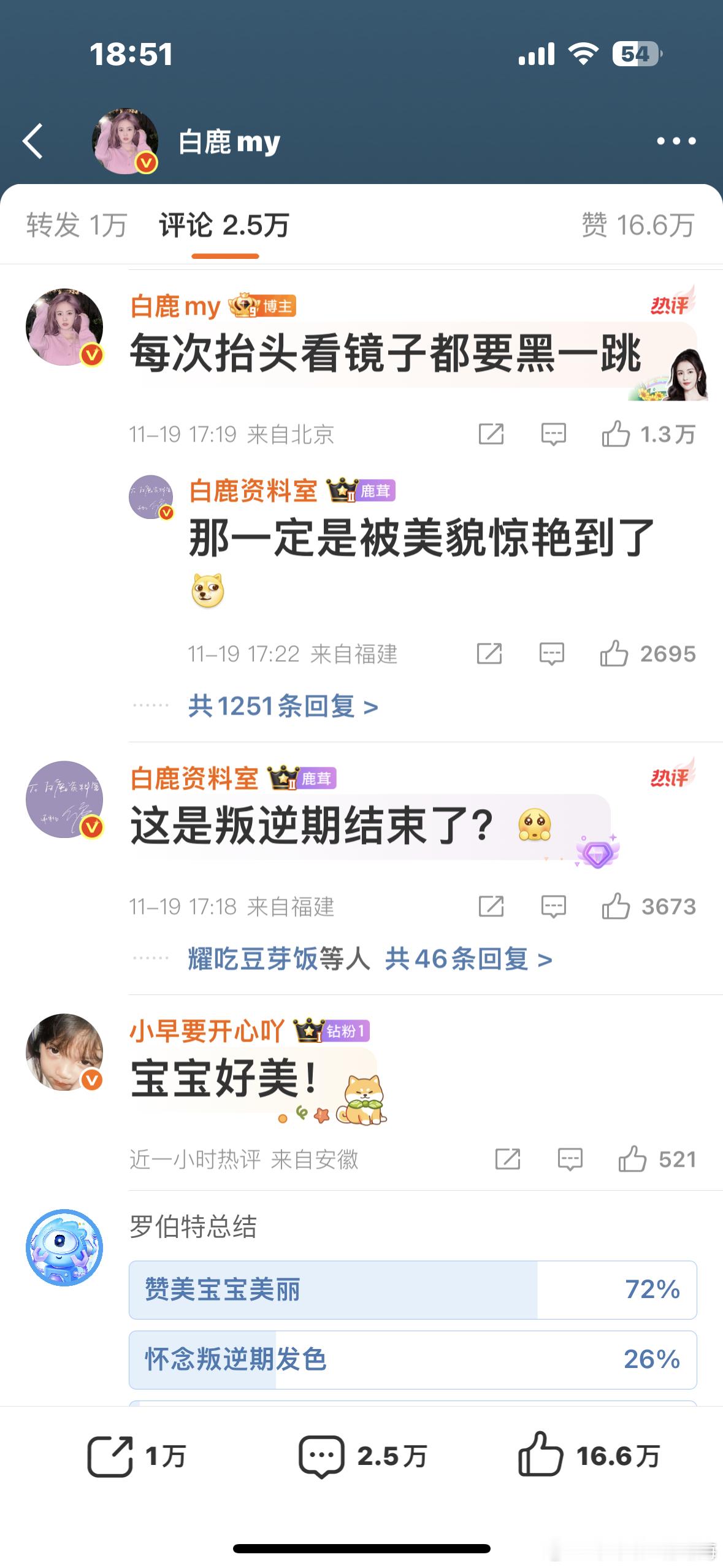 白鹿发博“嗨”评论区互动这是对头发颜色不满意了吗?