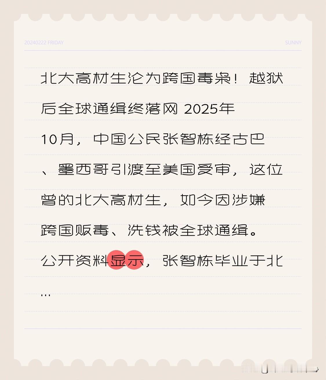 北大高材生沦为跨国毒枭!越狱后全球通缉终落网 2025年10月,中国公民张智栋经古巴、墨西哥引渡至美国受审,这位曾的北大高材生,如今因涉嫌跨国贩毒、洗钱被全球通缉。 公开资料显示,张智栋毕业于北大附中,2006年考入北大西语系,2009年公派墨西哥留学。2010年返墨后,他从矿产生意逐步涉足毒品交易,构建起以洛杉矶、亚特兰大为据点的贩毒网络,涉嫌走私可卡因1000余公斤、芬太尼1800余公斤,通过150家空壳公司洗钱超2000万美元。 2024年10月张智栋在墨西哥被捕,2025年7月通过地道越狱,国际刑警随即发布红色通缉令。其辗转多国后,因伪造文件在古巴落网,最终被引渡至美。主审法官曾审理锡那罗亚贩毒集团头目案件,目前案件正在审理中。 从寒门学霸到毒枭,张智栋的堕落轨迹令人唏嘘,也折射出跨国毒品犯罪的隐蔽性与危害性。
