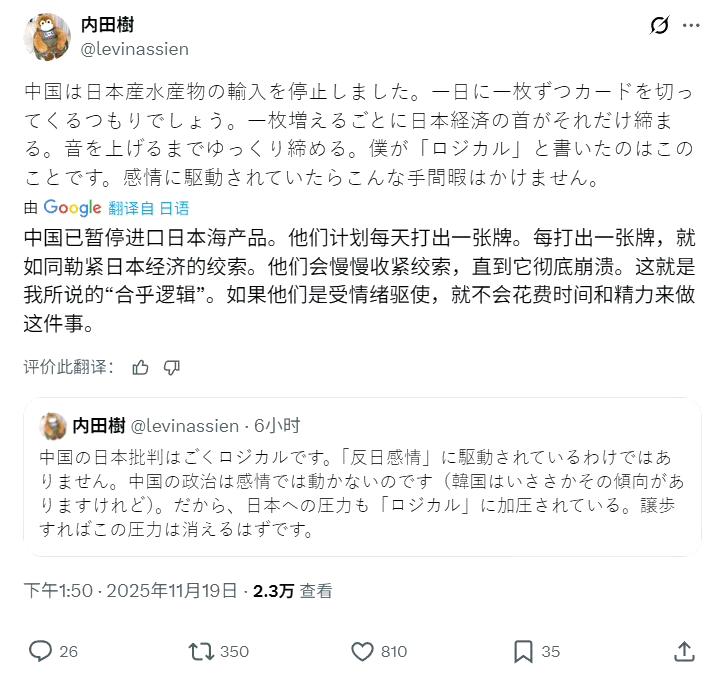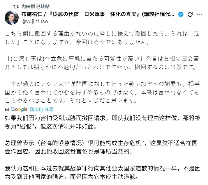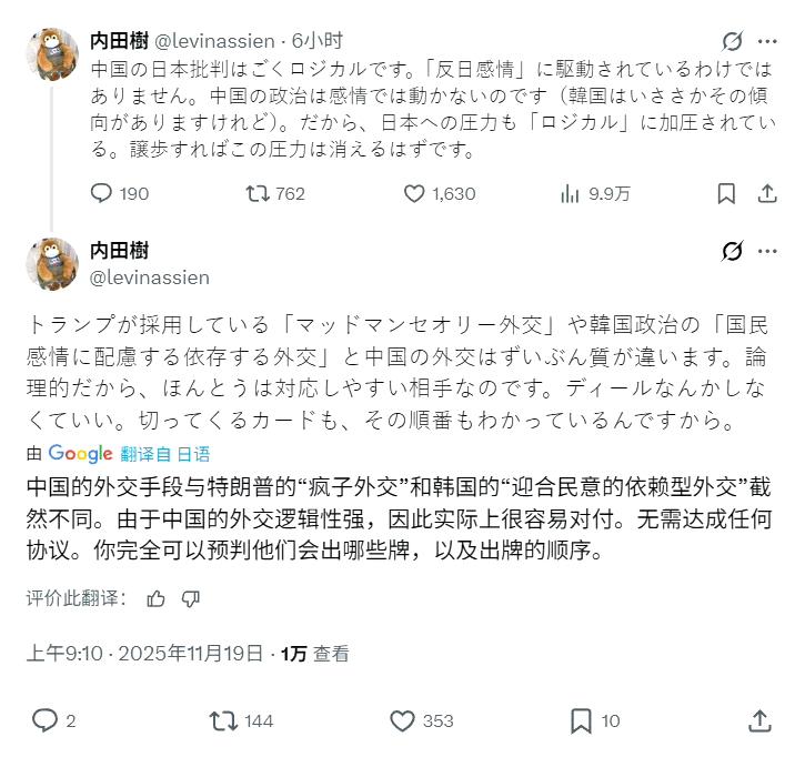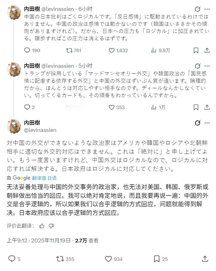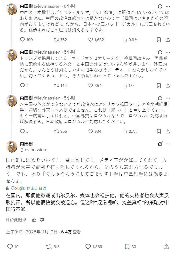 日本知名日本学者、评论家、武道家内田树对近期中日冲突的评价:总的说来中国人其实是最讲道理的,很多事情都是有规律可以寻找,不会胡搅蛮缠,更不会无事生非。但如果惹到了中国人,肯定是要还回去的。疯婆子就是个疯子,连中国这么好打交道的邻居,都处不好关系,绝对处理不好其他的国际关系。