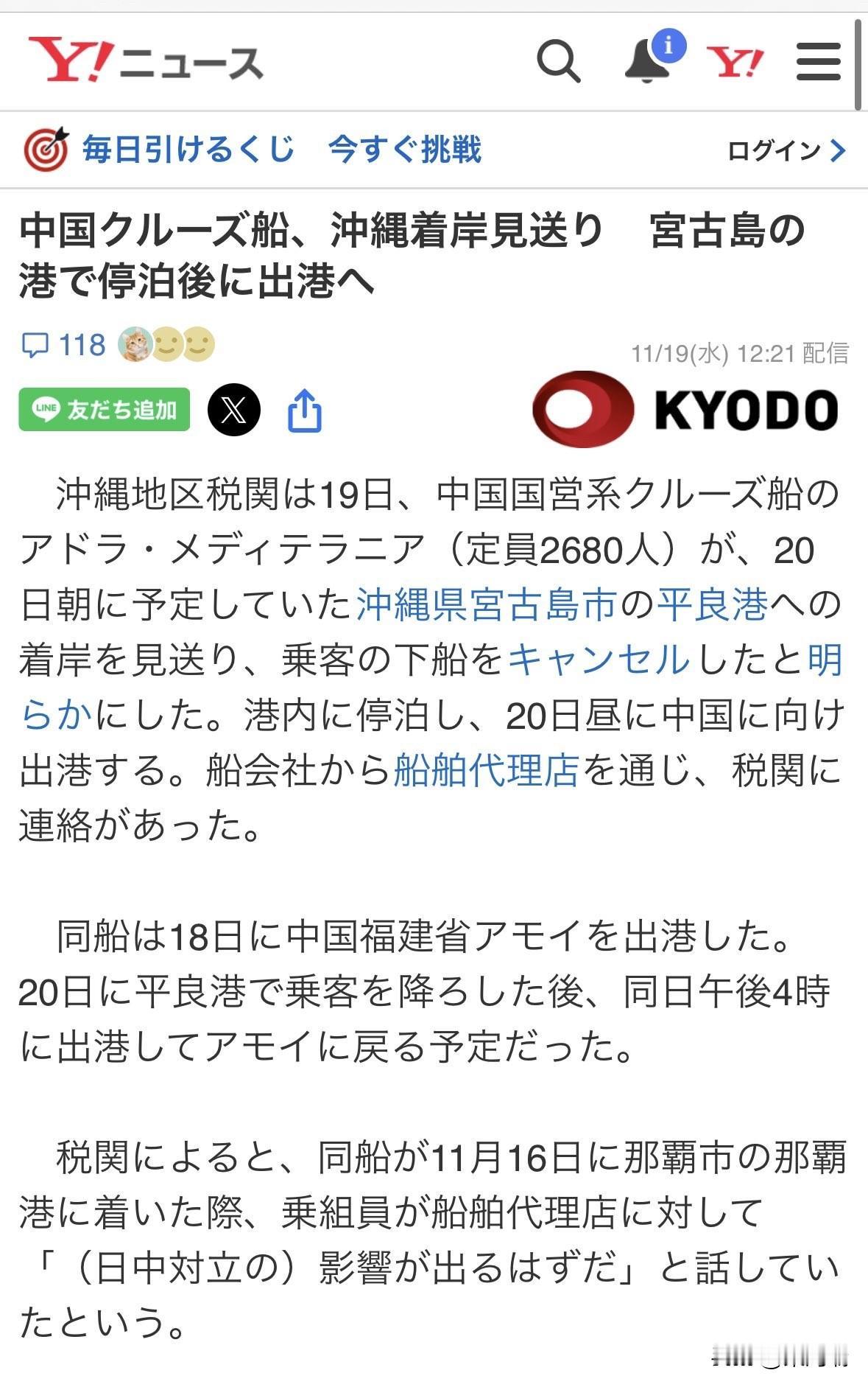 冲绳地区海关 11 月 19日透露,中国邮轮爱达·地中海号(定员2680人),原定于20日早上抵达冲绳县宫古岛市平良港,中方通知取消了所有乘客的下船。邮轮将港口内稍作打卡停留,中午直接返回中国。 分析人士指出,此次邮轮事件凸显经济报复已波及旅游业,双边贸易额逾3000亿美元的伙伴关系正面临严峻考验。冲绳当地旅游业者忧心,中国游客占比高达7成,此波冲击恐延烧至明年。