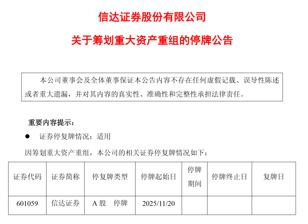 信达证券、东兴证券亦公告称,公司A股股票将于2025年11月20日(星期四)开市时起开始停牌,预计停牌时间不超过25个交易日。