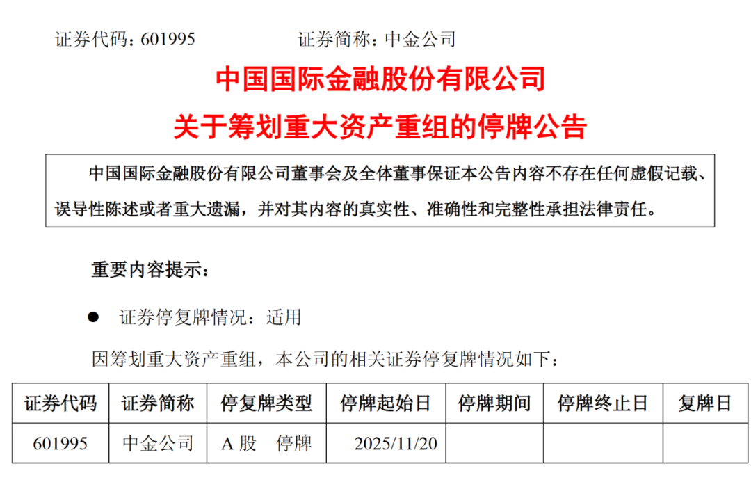 中金公司公告称,公司A股股票将于2025年11月20日(星期四)开市时起开始停牌。本次重组涉及到A+H股两地上市公司同时吸收合并两家A股上市公司,涉及事项较多、流程较为复杂,根据上海证券交易所的相关规定,预计停牌时间不超过25个交易日。
