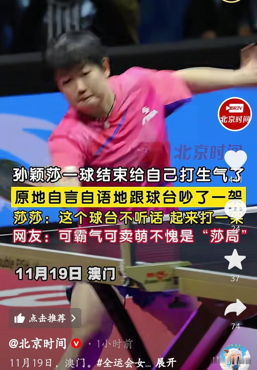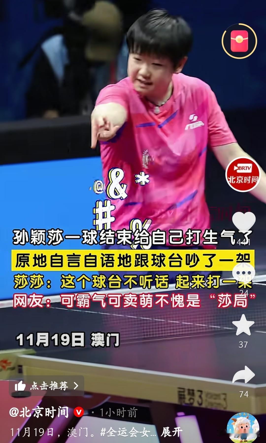 孙颖莎和球台“吵架”了!这反差萌我能看十遍!谁能想到世界冠军输球会找球台撒气啊!11月19日澳门赛场,孙颖莎打丢一个关键球,指着球台碎碎念! 那小表情皱得像颗小包子,气鼓鼓的样子活脱脱是幼儿园小朋友跟玩具闹别扭;可下一秒拿起球拍,眼神唰地变狠,扣球时的气场能掀翻球馆,网友直接笑喷:“莎局这是切换‘奶凶模式’了?” 又凶又萌的反差感直接戳中笑点,赛场上是能打穿对手防线的大魔王,私下是跟球台置气的小迷糊,这谁能不爱啊!