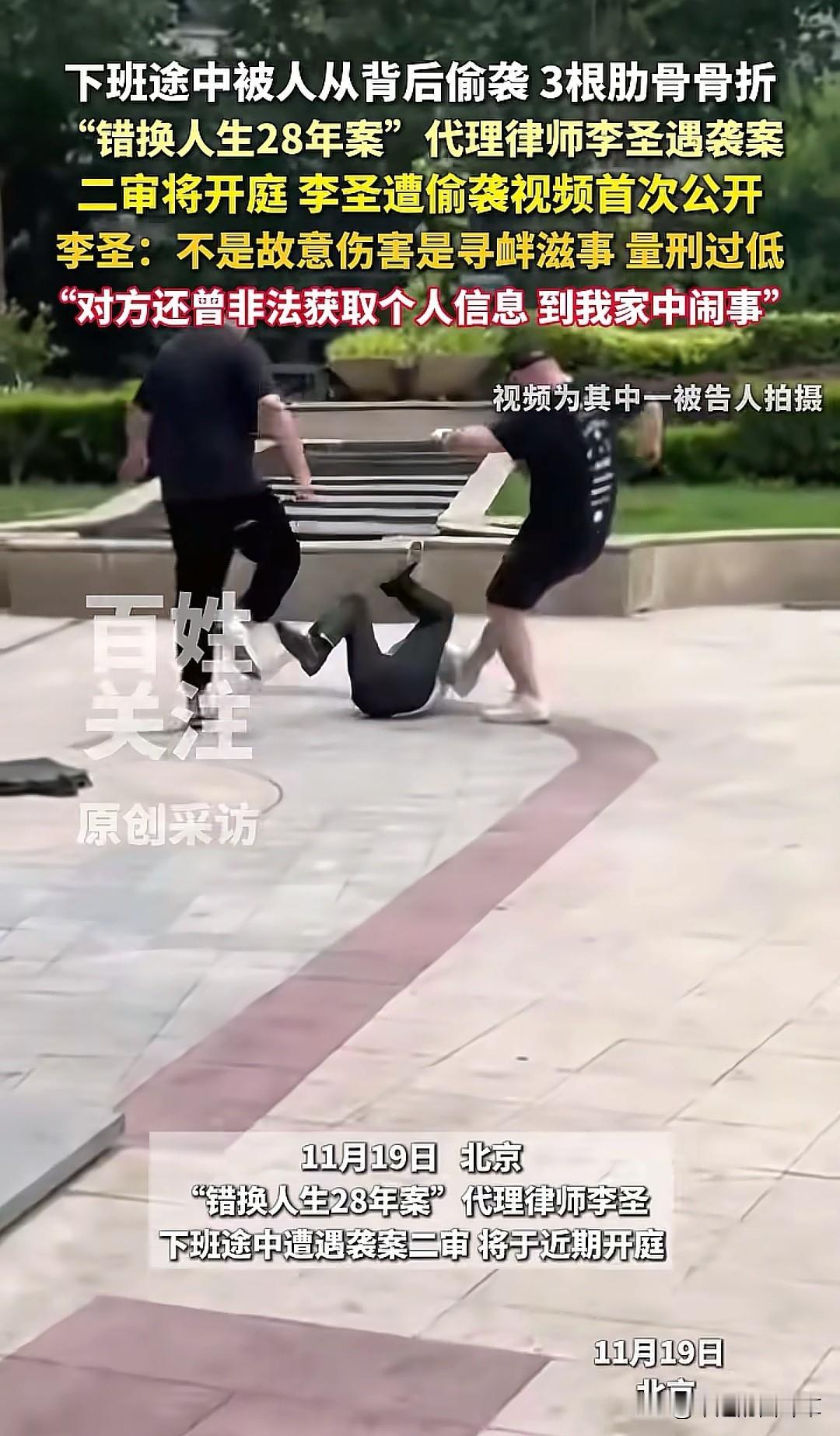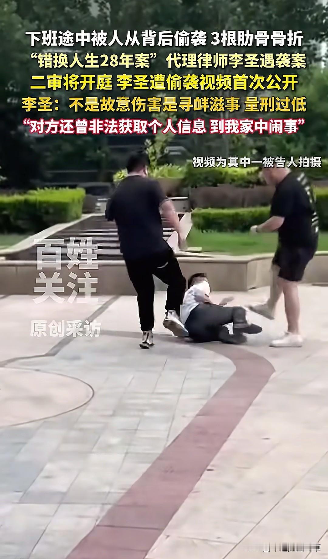 李圣律师下班被打视频曝光!画面太狠,他的遭遇早不是偶然! 俩壮汉突然从背后猛扑上来,一把就把李圣律师狠狠掀翻在光溜溜的步道砖上!根本不给人反应的机会,俩人的脚跟下了狠劲似的,轮番往他身上踹,一下接一下没停手,疼得他惨叫声都发颤,蜷在地上缩成一团,最后直接被打得折了3根肋骨——更离谱的是,这段施暴视频,居然是其中一个打人的自己拍的! 这哪是突发冲突啊?之前李圣律师的母亲被人上门打伤,办公室遭恶意抹屎,他自己还被跟踪殴打;对方甚至非法获取他的个人信息,闯到家里闹事——这些糟心事,全跟“错换人生28年”案脱不了干系! 现在这袭案件二审要开庭了,李圣直言这就是寻衅滋事,之前量刑太轻!更反常的是,关联案件庭审时,四个被告全程戴口罩遮脸,他想认清真容都难;这伙人也太矛盾了:光天化日动手还敢拍视频,监控和法律全不放在眼里,可庭审又遮遮掩掩,打完还想托人“说情”息事宁人。 到底是谁在背后撑腰,让他们这么无法无天?难道真觉得暴力能压过法律?好在李圣手里攥着7段行车记录仪素材,真相绝对藏不住!这事儿你怎么看?欢迎在评论区聊聊你的想法,一起等一个公道!