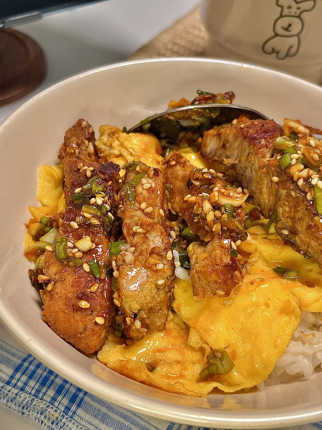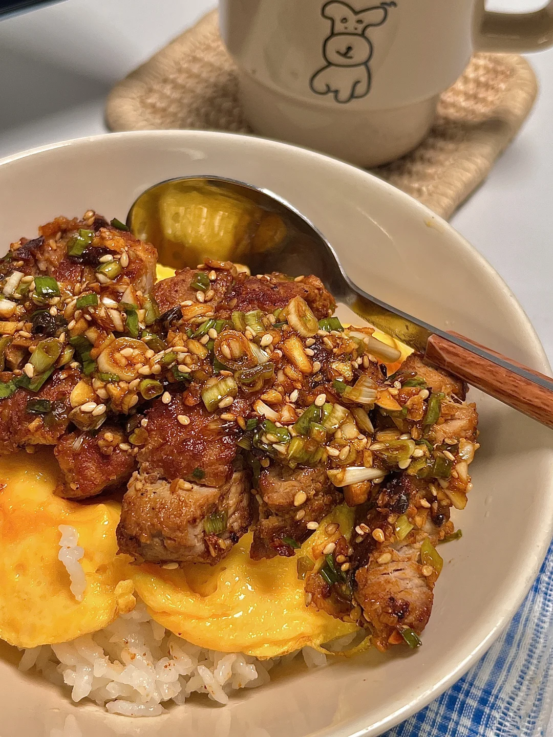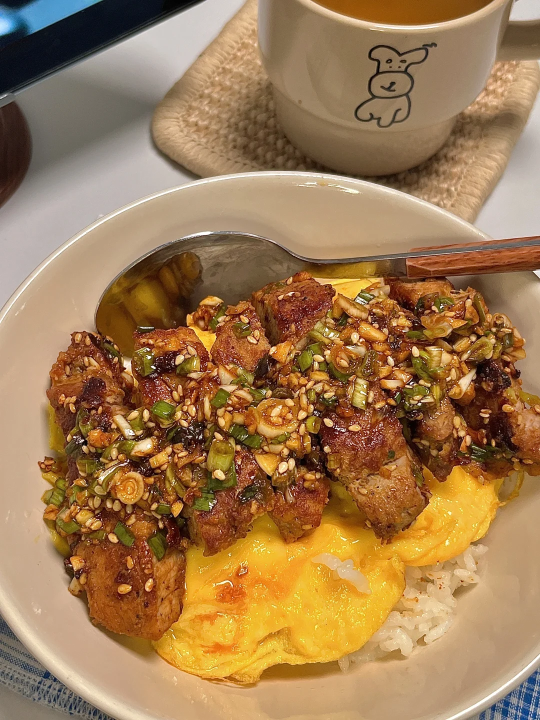 🍴今日份一人食: 滑蛋盐葱酱猪排饭 乌龙茶🍵 . 盐葱和猪排肉也特搭,肉煎的焦焦的,撒上多多的盐葱酱,味道巨香浓😋巨下饭,配着鲜嫩的滑蛋,每一口都超满足的!一段时间不吃都会想念的程度,爱吃的宝一定要去试试呀✌🏻