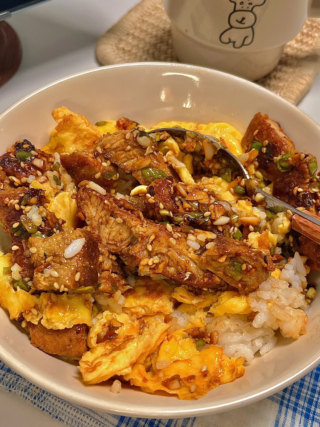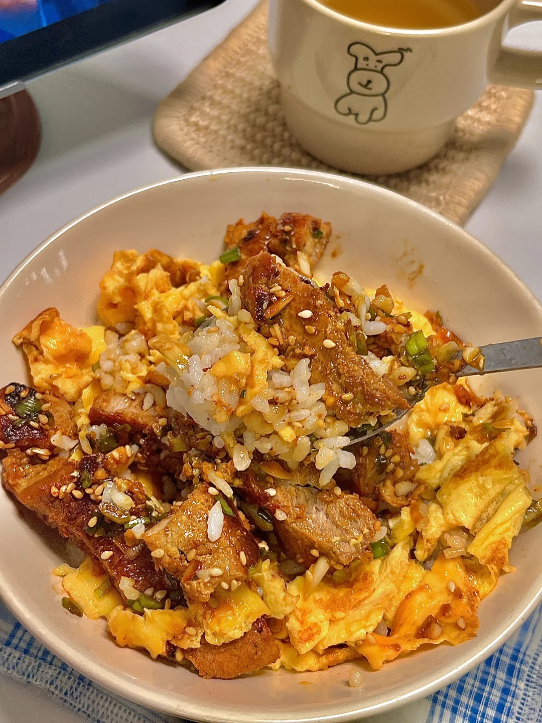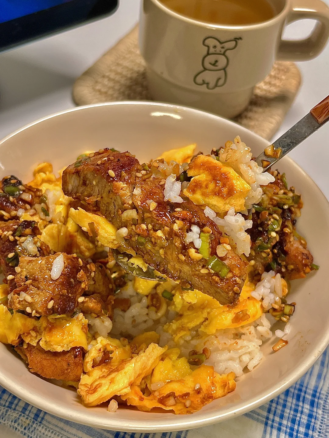 🍴今日份一人食: 滑蛋盐葱酱猪排饭 乌龙茶🍵 . 盐葱和猪排肉也特搭,肉煎的焦焦的,撒上多多的盐葱酱,味道巨香浓😋巨下饭,配着鲜嫩的滑蛋,每一口都超满足的!一段时间不吃都会想念的程度,爱吃的宝一定要去试试呀✌🏻