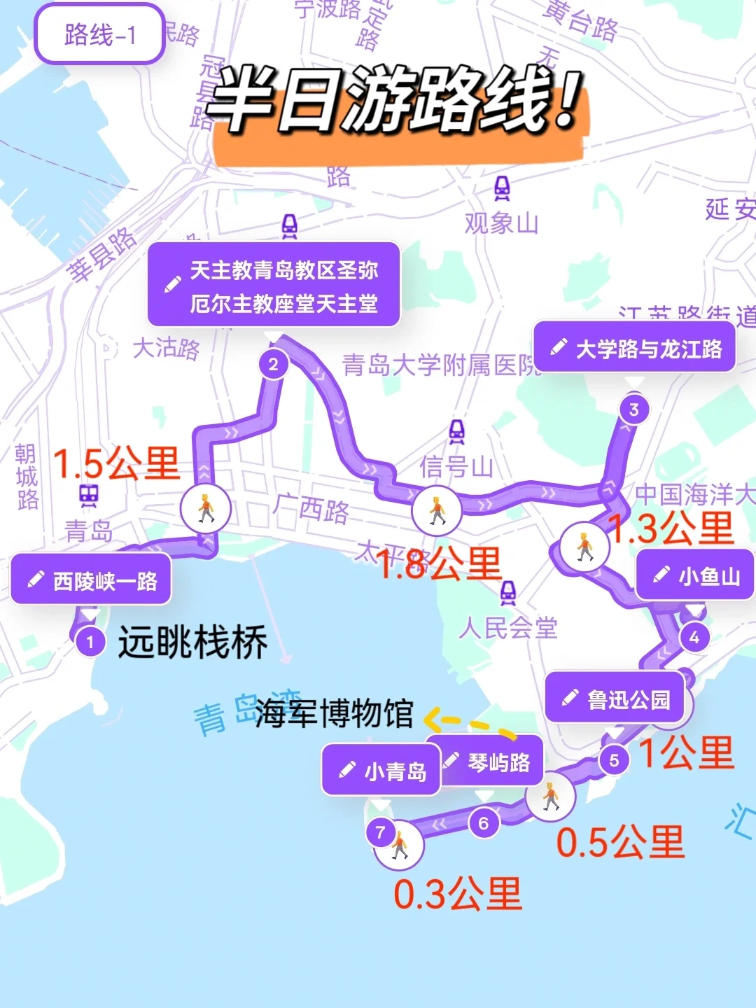 西陵峡一路➠圣弥厄尔大教堂➠大学路➠小鱼山➠鲁迅公园➠琴屿路➠海军博物馆➠小青岛🌅