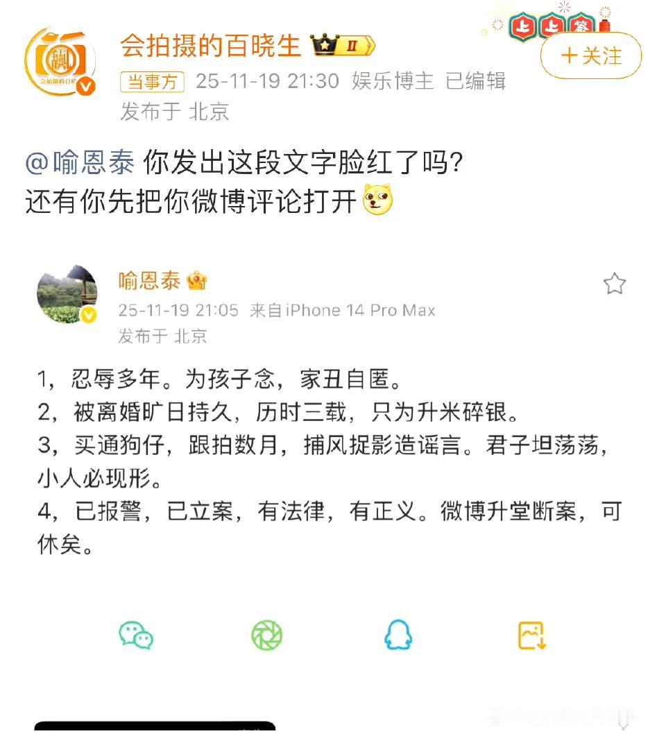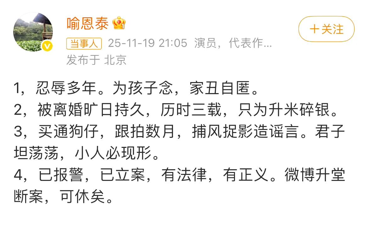 时隔五年更新微博,喻恩泰回应婚变风波称:为孩子忍辱多年,家丑未外扬;离婚纠纷已持续三年,因为财产分割争议;指控前妻史林子买通狗仔、长期跟拍、制造谣言,自己已报警立案 喻恩泰回应狗仔回应喻恩泰