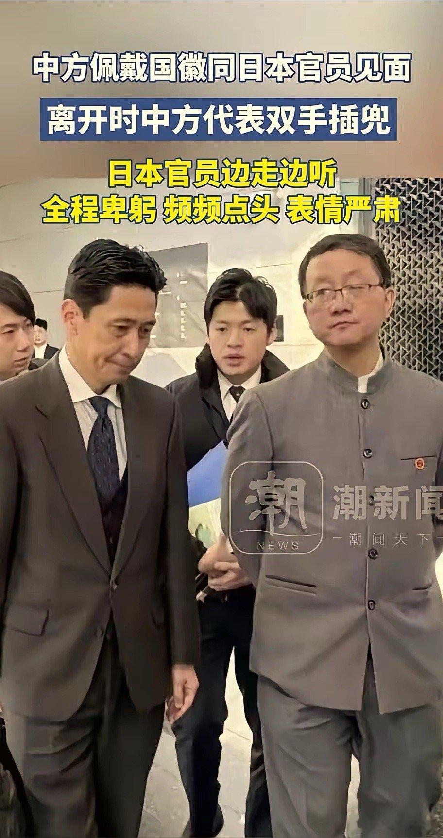 双手插兜的意思就是我现在还在克制,不要等我出手。潮新闻发的这张图很霸气!中国官员离开时佩戴国徽双手插兜,这派头真给咱们涨志气。日本官员卑躬屈膝站在那里,一副晚辈给长辈道歉的样子。