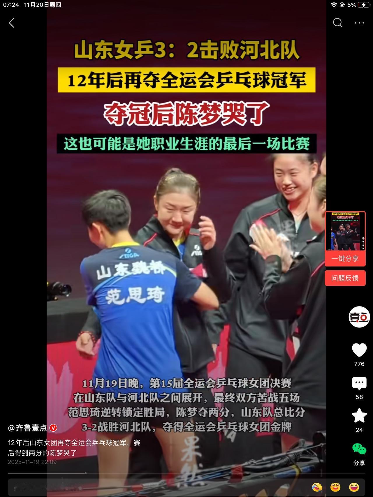 咱自己省队获得了冠军,咱先自己高兴高兴吧!你说这都什么事儿,你喜欢谁没毛病,你不能在人家夺冠了,你敢对方的名字?有意思吗?咋,哪一个球是你们让的?不是俺们姑 娘 们拼出来的? 没有范思琦最后的绝杀那冠军就是你们的了,你们再喊。真是应了樊振东那句话了,赢也不行,输也不行。 竞技体育,要是你喜欢谁谁就行,那还有什么好看的。吴艳妮,可以说是绝对实力了,被刘景扬给超了。 你说商量下,我最后一届了,我那什么,你让一让我,我拿个金牌,回家吃老本,回家谋个一官半职。坐享其成。 那可能吗? 对吧?旭日东升说,赢了真好,陈梦给自己的时代画上了一个圆满的句号。恭喜陈梦,以后远离这变了味的圈子,潇洒别回头,好好享受生活。 这才对,卖卖货,吃吃饭。