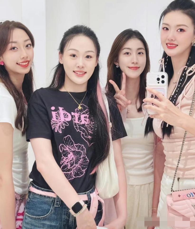 4姝略施粉黛的珍贵合照:我只认出了最右侧背着坤包、拿着手机的''排球女神''张常宁,她身旁秀发垂肩比耶的美女是刁琳宇吗?火眼金睛的你还能认出哪位姑娘?