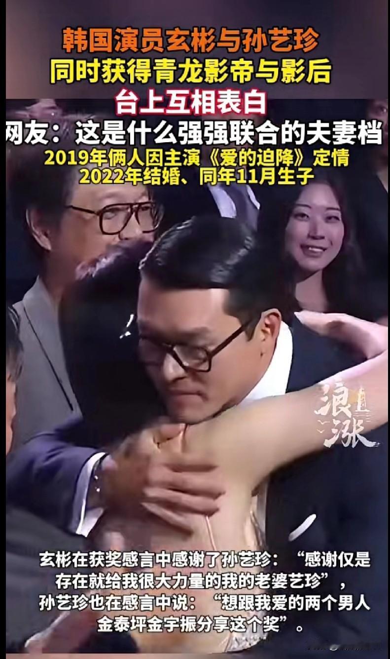 《爱的迫降》CP杀疯了!玄彬孙艺珍夫妻同拿青龙影帝影后,台上告白甜到齁 谁能拒绝这种“剧里CP成真+事业爱情双丰收”的剧本啊!!😭 刚刚青龙奖现场直接炸了——玄彬孙艺珍夫妻俩居然同时拿了影帝影后!上台领奖的时候玄彬先开口:“感谢光是存在就给我力量的老婆艺珍”,孙艺珍紧接着接话:“想和我爱的两个男人(玄彬+儿子)分享这个奖”,台下直接集体尖叫好吗! 这俩从《爱的迫降》定情,2022年结婚同年生娃,现在连奖杯都要凑一对,这是什么“强强联合天花板”啊! 关键是玄彬说“老婆是力量”的时候,眼睛都在发光,孙艺珍提到儿子那笑的,谁看了不说一句“这才是爱情最好的样子”! 这波真的把“从剧里甜到现实”焊死了,建议内娱按这个甜度卷起来!
