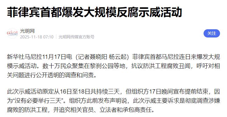 菲律宾民众抗议进入第二天,数十万人云集首都马尼拉,给了小马科斯一个体面下台的机会! 老百姓不是平白无故来堵街的,这火憋了快半年了。今年入秋以后,菲律宾遭遇了好几场台风,尤其是超级台风“凤凰”登陆那回,吕宋岛不少地方被淹,27人没了性命,36人受伤,老百姓趟着齐腰深的水转移,家里的东西泡得稀烂。 可最让人气愤的不是天灾,是人祸——那些本该挡水的防洪设施,要么是偷工减料的“豆腐渣”,要么干脆就是“幽灵项目”,审计下来才发现,8000多个防洪项目里,至少421个根本没开工,钱却早就进了某些人的腰包。 财政部算过一笔账,这些贪腐直接造成了1185亿比索的经济损失,换成人民币得有121个亿,这笔钱要是真花在堤坝上,也不至于让台风一来就一片狼藉。 其实最早把这事儿捅出来的还是小马科斯自己,7月国情咨文里他主动提了防洪工程的腐败问题,后来还成立了个独立调查委员会,说要“一查到底,没人能豁免”。刚开始老百姓还抱着点希望,可查来查去,撤的都是些小角色,要么是部门里的科员,要么是几个承包商。 直到9月份听证会直播,大家才看清门道:15家承包商拿了全国20%的防洪合同,差不多1000亿比索,其中有家叫迪斯卡亚的公司,老板夫妇车库里停着28辆欧洲豪车,在听证会上直接承认给议员送回扣,说“不送根本拿不到项目”。 更让人窝火的是小马科斯的表亲、众议院议长罗穆亚尔德斯也卷在里面,最后只是引咎辞职,没见被追究责任。这时候老百姓才明白,所谓的“彻查”不过是找几个替罪羊,真正的大头根本动不了。 9月21号就闹过一次大的,那天正好是小马科斯父亲宣布戒严52周年,10万人上街抗议,警民冲突里还死了一个人,抓了200多号人。可小马科斯只是撤了公共工程部长这些亲信,冻结了几个涉案人员的资产,说起来冻结了63亿比索的资产,跟1185亿的损失比起来,简直是九牛一毛。 到了11月,行政秘书和预算部长又因为涉案辞职,可这时候老百姓已经不买账了。这次抗议的组织者是当地的“基督的教会”,信徒一来就是几十万,现场有人举着被洪水泡烂的照片喊:“我们要的是能挡水的堤坝,不是官员的豪车!” 比口号更扎心的是政界人士的表态,有前议员直接站在临时搭的台子上对军警喊话:“你们的工资是纳税人给的,不是小马科斯给的!当年埃斯特拉达怎么下去的,你们忘了?” 这话戳到了要害——谁都记得2001年埃斯特拉达就是因为军警撤回支持,才不得不下台的。现场不少军警脸上都露着犹豫,有人悄悄把头盔摘了,这场景让小马科斯那边彻底慌了。 更有意思的是抗议原定要搞三天,结果第二天晚上组织方就宣布提前结束,说“没必要再耗着”,这话里的底气明眼人都懂——意思是该给的压力已经给够了,就看你小马科斯识不识相。 小马科斯的反应更能说明问题,他没敢派军警硬压,反而让内政部跳出来说要“调查要求总统下台的言论”。这招真有点此地无银三百两,要是心里没鬼,犯得着跟老百姓的嘴较劲吗? 要知道之前他还嘴硬说“抗议是少数人煽动”,可转头就查言论,明摆着是怕那些呼吁军警倒戈的声音传开。有知情人士说,他私下里给军警高层打电话,又是许诺好处又是强调“稳定”,生怕这些人真的倒戈。毕竟他爹当年就是被人民力量革命赶下台的,这种家族记忆让他对街头抗议格外敏感。 现在的局势其实很清楚,老百姓要的不是赶谁下台,是要真金白银的反腐,要能挡水的堤坝。小马科斯要是还抱着“丢卒保车”的心思,只撤几个手下糊弄事,这场风波根本压不下去。 这次教会牵头的抗议已经说明,反对他的力量不再是零散的群体,而是形成了跨阶层的联盟。连之前支持他的商界人士都开始慌了,毕竟贪腐把经济拖得够惨,第三季度经济增长已经明显放缓,再闹下去没人受得了。 说白了,老百姓给的台阶已经很明显了:要么你自己拿出真本事反腐,把涉案的大头都揪出来,给大家一个交代;要么就体面下台,别等军警真的撤了支持,落得跟埃斯特拉达一样的下场。 小马科斯现在夹在中间,硬来怕激化矛盾,软了又怕失去权威,这种两难境地,说到底都是自己造成的——要是一开始就真刀真枪反腐,而不是搞表面功夫,也不至于把老百姓逼到街头来要说法。 这场抗议不是终点,要是解决不了根本的贪腐问题,下次再出事,可就没这么体面的台阶了。