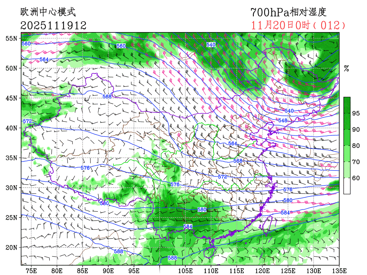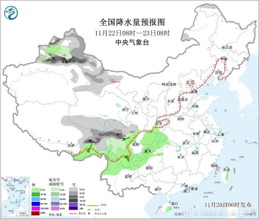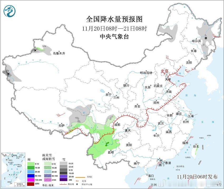 【降水】昨天到今晨,云南的站点包揽了降水榜前9。云南凤庆、芒市出现了大雨。从云图和形势场看,云南一带依然被降水云系覆盖,对应700百帕的西南暖湿气流在低空冷垫上滑升导致。此外东北一带有高空槽云系,可能导致一些弱降雪。22日还有高空槽东移,导致新疆北部出现明显降雪。而我国其他大部地区,今后3天晴朗干燥。预计11月20日08时至21日08时,内蒙古东北部、黑龙江东部、吉林东部、新疆伊犁河谷和南疆西部山区、西藏东部、青海西南部、川西高原中部等地部分地区有小雪或雨夹雪,局地有中到大雪(5~9毫米)。西藏东南部、川西高原南部、云南西部和北部等地部分地区有小雨,局地有中雨。预计11月21日08时至22日08时,黑龙江北部、新疆北疆北部和南疆盆地南部、西藏东部、青海南部、川西高原北部等地部分地区有小到中雪或雨夹雪,其中,新疆北疆北部、西藏东部、青海南部、川西高原北部等地局地有大到暴雪(10~12毫米)。四川西南部和云南西部和北部有小雨,局地中雨。预计11月22日08时至23日08时,新疆北部和东部、甘肃西北部、青海南部、西藏东部、川西高原中北部等地部分地区有小到中雪或雨夹雪,其中,新疆沿天山地区和伊犁河谷、西藏东部、川西高原北部等地部分地区有大到暴雪,局地大暴雪(20~25毫米)。新疆伊犁河谷、西藏东南部、陕西南部、川西高原南部、云南北部、四川盆地东部和南部、贵州西部、重庆等地部分地区有小雨,局地有中雨。