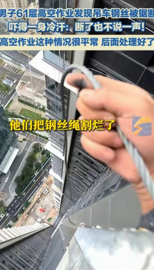 吓出一身冷汗!广东东莞,男子在61层高空作业,忙了半天一低头,突然发现不对劲儿,那根碗口粗的钢丝绳,不知道被谁给锯断了!   广东东莞的一栋摩天大楼里,61层的高空作业平台外,城市的车流在脚下化作模糊的线条,一名男子正准备开展施工作业。   俯身检查安全设备的瞬间,他的目光被悬挂身体的钢丝绳牢牢锁住——那根碗口粗的钢丝赫然出现一道狰狞的锯痕,大半已然断裂,断口锈迹斑斑,仅靠少量残留钢丝和一颗螺丝勉强卡住,维持着摇摇欲坠的承重状态。   这一幕让男子瞬间浑身发紧,腿肚子发软,扶着护栏好一会儿才缓过神,后背早已被冷汗浸透。   61层的高度,意味着一旦钢丝绳彻底断裂,坠落的瞬间连反应的机会都没有,后果不堪设想。   他强压着慌乱,用略微颤抖的手拍下现场视频,既为留存证据,也为记录下这致命的隐患。   男子并非气愤钢丝绳本身断裂,让他难以接受的是这种“图省事不管死活”的处理方式——明知钢丝已断,却用一颗螺丝临时糊弄,完全是拿高空作业者的生命当儿戏。   万幸的是,他在作业前及时发现了问题,没有带着隐患登上吊篮,才逃过一劫。   事件发生后,项目负责人迅速赶到现场,当即下令停工,更换了全新的钢丝绳,还专门调配安检员对所有设备进行全面彻查;   经历过这场惊魂,他特意提醒同行,上吊篮前一定要仔细检查安全设备,不能有丝毫马虎。   关于钢丝绳断裂的原因,外界有着不同的猜测。   不少人根据“被锯断”的痕迹,怀疑存在蓄意破坏的可能,毕竟过往曾有因邻里矛盾误割安全绳导致工人坠落的案例,若此次破坏属实,肇事者或将涉嫌以危险方法危害公共安全罪,面临法律的严厉追责。   但结合高空作业安全规范分析,也存在另一种可能性:钢丝绳长期使用后磨损严重,却未得到及时检修更换,或是存在规格不符、违规操作等问题,最终形成了断裂隐患。   无论是人为破坏的恶意,还是检修缺位的疏忽,本质上都是对生命的漠视。   高空作业本就伴随着极高的风险,每一项设备、每一个操作细节都关乎生死,容不得半点“差不多”的妥协。   网友们在了解事件后,纷纷表达了后怕之情,谴责这种置他人安危于不顾的行为,更呼吁安全监管不能流于表面,必须落到实处。   男子的遭遇并非个例,他后续曾提到“这种情况很正常”,短短五个字背后,是高空从业者不得不与危险相伴的无奈,是用生命博弈的行业隐痛。   但安全从来不是“习惯就好”的妥协,那根悬在61层高空的钢丝绳,承载的不仅是作业人员的体重,更是一个个家庭的期盼。   最终,这场惊魂事件在及时处置后没有酿成悲剧,但它留下的警示却格外沉重。   无论是作业人员岗前的仔细检查,还是项目方定期的设备检修,亦或是对潜在危险行为的追责,每一环都不能缺位。   希望这根被“糊弄”的钢丝,能真正唤醒各方的安全意识,让每一位高空作业者都能在扎实的安全保障下,安心工作,平安归家。   今天的分享到这里就结束了,大家对此事有何看法,欢迎在评论区留言和讨论,感兴趣的可以点击头像加关注,我将每日更新优质内容,我们下期见。
