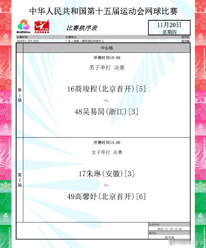 全运会网球决赛日10:00,(浙江)吴易昺vs(北京)商骏程14:00,(安徽)朱琳vs(北京首开)高馨妤吴易昺能否为浙江再添一金,朱琳能否在全运会将金牌拿下?