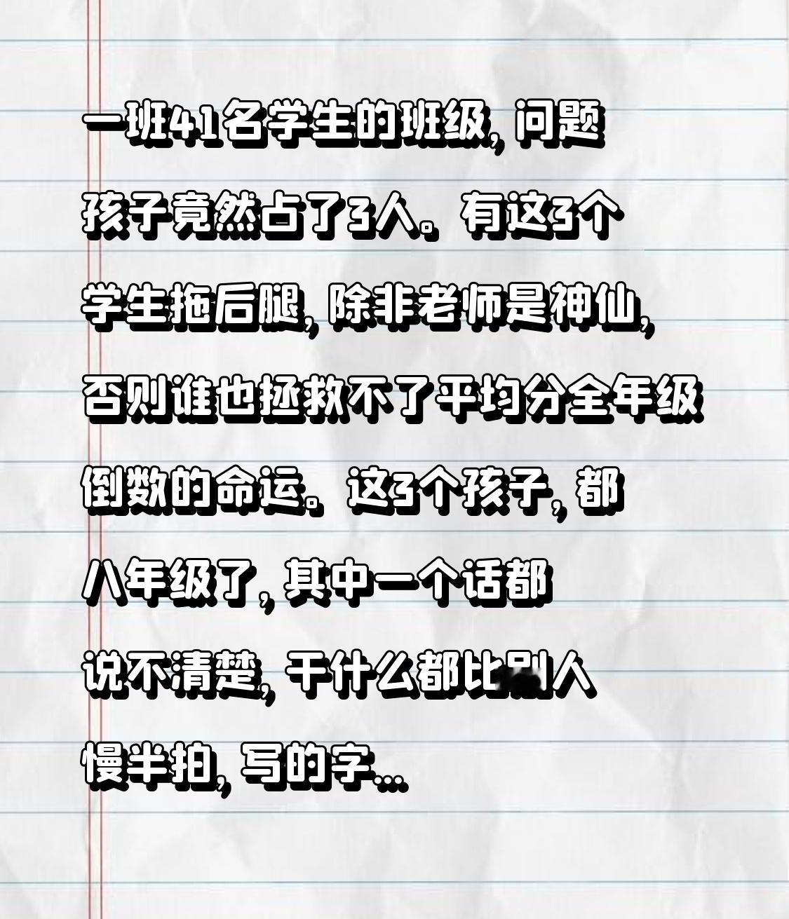 一班41名学生的班级,问题孩子竟然占了3人。 有这3个学生拖后腿,除非老师是神仙,否则谁也拯救不了平均分全年级倒数的命运。 这3个孩子,都八年级了,其中一个话都说不清楚,干什么都比别人慢半拍,写的字就像鬼画符,完全看不懂。 考试时有选择题的科目,还有可能瞎猫逮着一个死耗子,考个2分4分的,没有选择题的科目,就毫无悬念的0分。 语文老师天天拿着他的作文在办公室里展示:没有一个字看得懂,怎么批改?可是不批改又不行,领导们检查业务会批评老师,说她批改作业不认真啊! 碰到这种学生,大家说老师难不难? 还有一个学生,听说出生时大脑缺氧,他倒是听话,可就听不懂老师讲的知识,考试时就抄试题,把题目抄写在空格上,看起来试卷填的满满当当的,结果各科都是0分。 还有一个学生,完全沉浸在自己的世界里,早上跑步,没有人把他带到队伍里,他都找不到集体。 除了上厕所,干什么都得派人盯着,否则就在校园里乱窜。 今年,我班的这三个学生天天把我们几位老师折磨的够呛,有他们在,谁也别想教学成绩了,能不出安全事故就阿弥陀佛了。