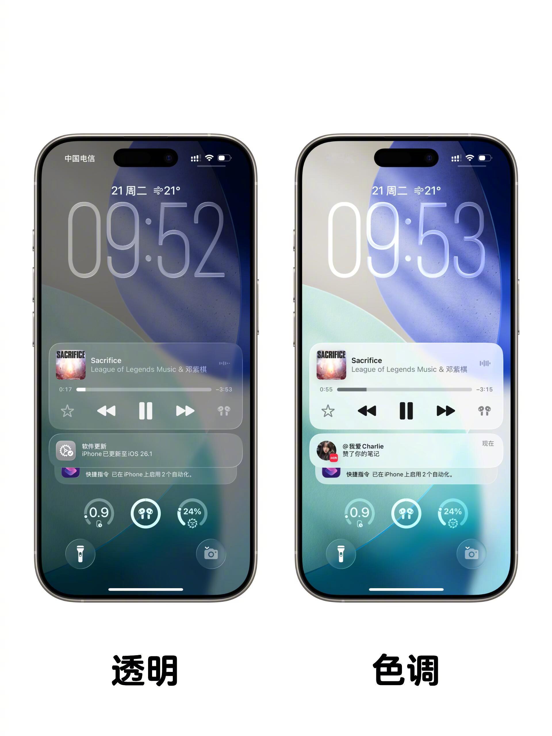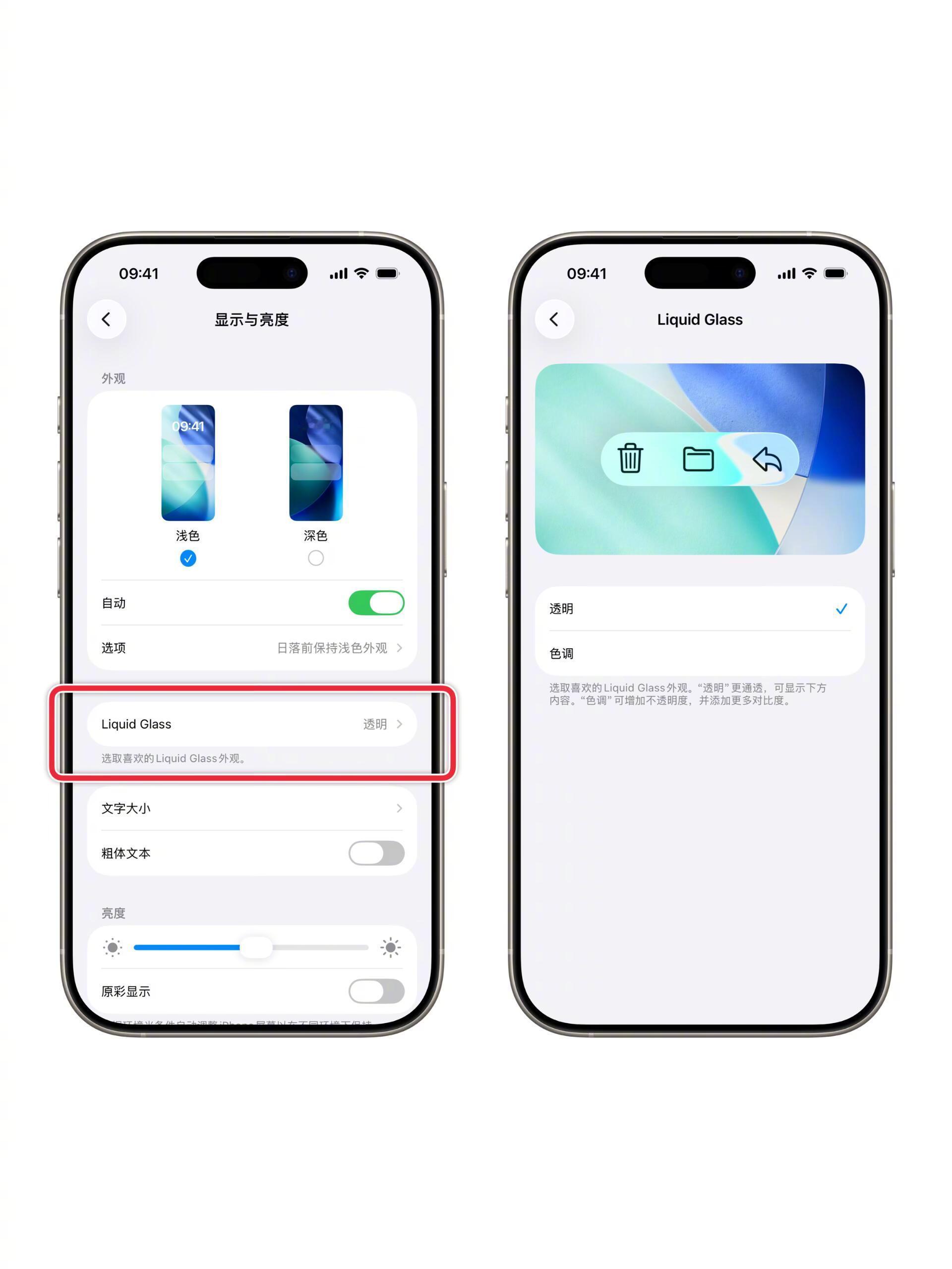 苹果还是给了选项…苹果推出 iOS 26.1 Beta 4 更新,在「显示与亮度」中新增了一个可切换 「液态玻璃」效果的选项。这是苹果在前几版反复调整视觉动态后的最新方案,还是把透明度效果的选择权交到用户手中 我个人还是更喜欢「透明」效果的另外苹果史诗级的新增了锁屏状态左滑开启相机的开关!