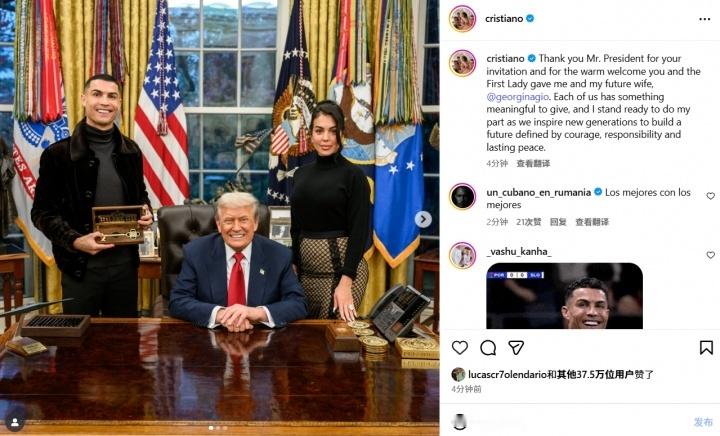 C罗近日获邀前往白宫,出席了白宫为沙特王储举行的一场晚宴。C罗在社媒发表动态感谢美国总统特朗普的邀请。C罗:“感谢总统先生的邀请,以及您和第一夫人对我及我未来的妻子乔治娜的热情欢迎。我们每个人都可以做出意义非凡的贡献,我已做好准备履行我的职责,激励新一代去建设一个以勇气、责任与持久和平为定义的未来。”
