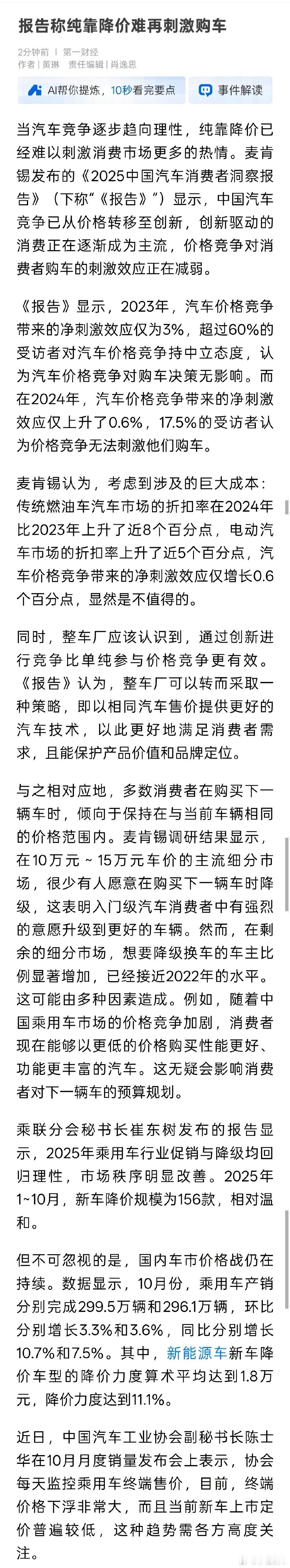现在买车的朋友们注意啦!最近有报告说,光靠降价已经很难让大家想买车咯 以前车企一降价,可能还有不少人动心,但现在不一样了,2023年降价对买车的刺激才3%,超过六成的人觉得“降不降价跟我买车没关系”;2024年这刺激感只涨了0.6%,还有快两成的人直接说“降价也勾不起我买车的兴趣”。 现在大家买车更看重“创新”,比如车的智能功能、新科技这些,单纯比谁便宜已经不香了。而且现在新车定价普遍都偏低,终端卖价还一个劲往下滑,连汽车协会都出来提醒说这趋势得重视重视 简单说就是:买车的人越来越理性啦,车企光靠“打价格战”不好使咯,得在车子本身的亮点上下功夫才行