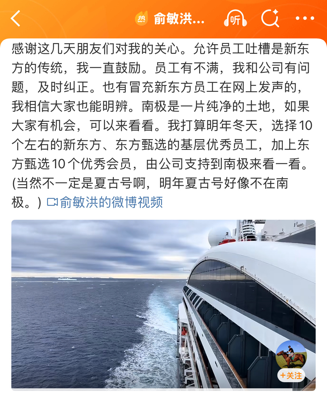 这下网友都满意了?俞敏洪会选10个左右的新东方或东方甄选的基层优秀员工,加上东方甄选10个优秀会员,去南极旅游,费用由公司承担。黑子别喷了,俞敏洪还是大气的。