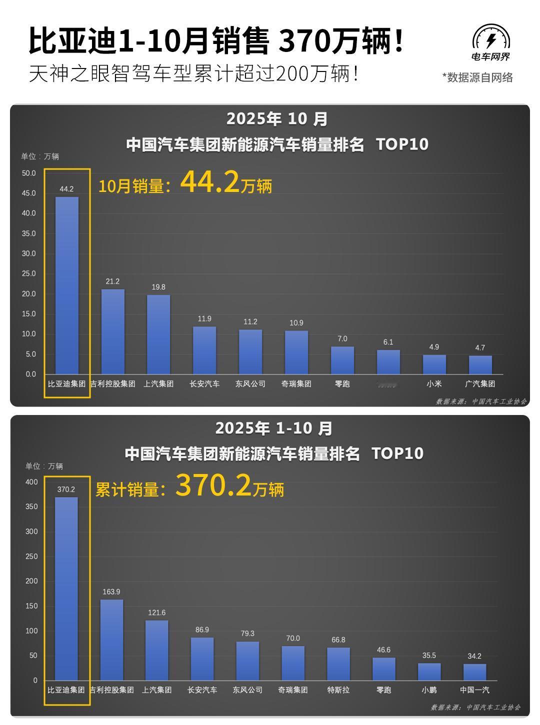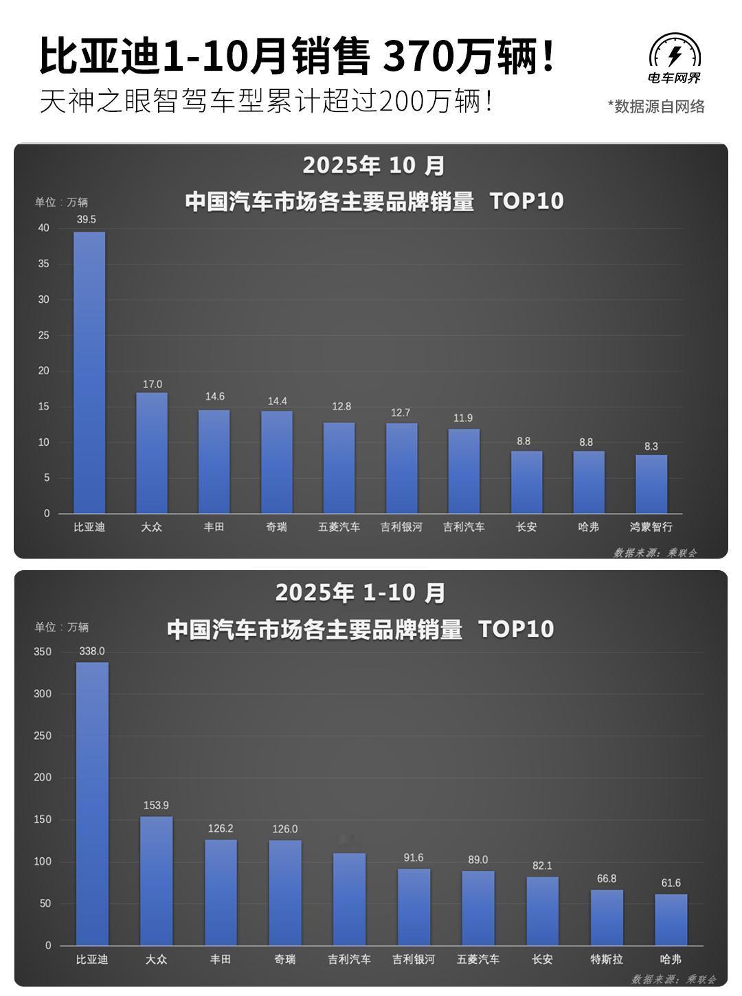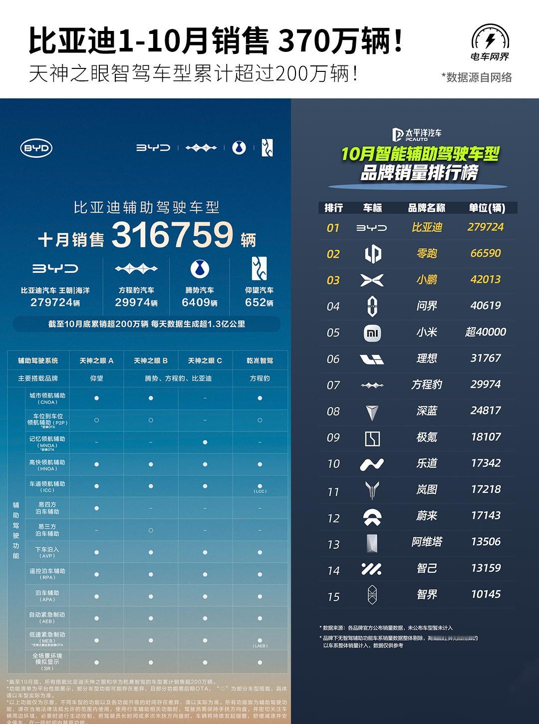 比亚迪今年前10个月卖得可真火,累计销量超过370万辆,稳居中国新能源汽车品牌榜首,全年目标完成率超80%,其中智驾销量突破新纪录,增长显著。 作为行业“研发之王”,比亚迪前三季度研发投入437.5亿元。其“天神之眼”辅助驾驶系统表现突出,截至10月底搭载智驾车型累计销量突破200万辆,日均智驾里程超1.3亿公里,在智能驾驶车型销量榜中遥遥领先。 在高端市场,方程豹品牌月销突破3万辆,实现同比大幅增长;海外布局亦加速推进,1-10月累计出口超78万辆,同比增长超130%,目前,全球117个国家和地区都能看到比亚迪的身影。 从技术投入、销量增长,到高端突破、全球扩张,比亚迪正以清晰的步伐加速驶向全球主场。有理由相信,它在年底必将交出一份更亮眼的答卷!【来自懂车帝车友圈】