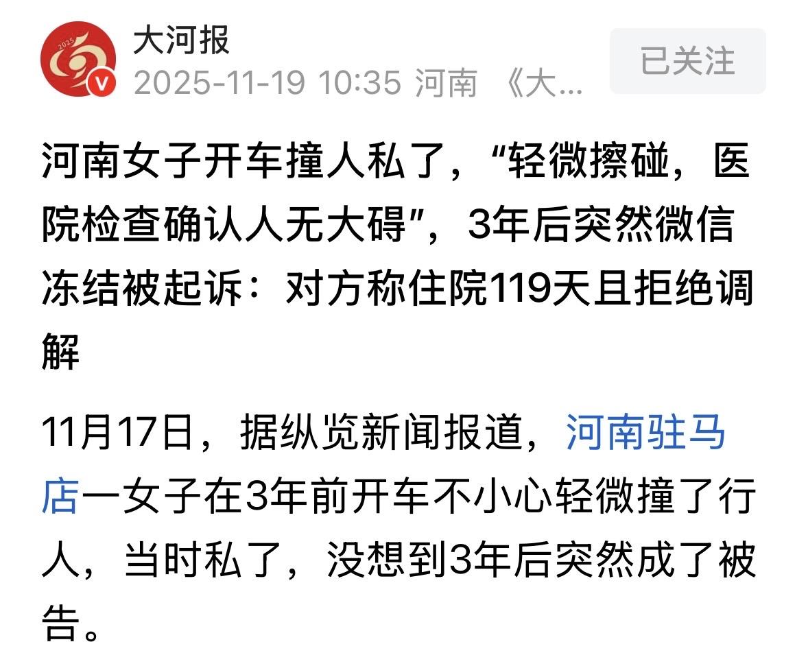 “冤不冤?”河南驻马店,3年前,女子开车时不小心撞到一路人,送医检查后,医生说只是轻微碰撞,并无大碍,女子放心了,然而,3年过去,女子微信突然被法院冻结,她这才知道,当初被撞那人把她起诉了,对方还拿出这些年的治疗证明,光住院就住了119天,女子这才意识到,自己可能被讹上了。   2025年4月,河南驻马店的李女士像往常一样准备扫码支付早餐费,微信支付却突然提示账户异常,无法完成交易。   反复尝试无果后,她查询账户明细才发现,自己的微信账户已被法院依法冻结。   这个突如其来的变故让她一头雾水,直到联系法院了解情况,她才得知,这场冻结的源头,是三年前一桩早已“了结”的轻微交通事故——她被当年那个被撞的路人张女士起诉了,对方不仅要求全额赔偿数万元,还拿出了累计119天的住院记录和康复治疗单据。   谁能想到,三年前一次看似顺利的私了,会埋下如此大的隐患。   时间拉回2022年11月4日早晨,李女士驾车上班途中,不慎与行人张女士发生轻微擦碰。   事发后,李女士没有丝毫犹豫,立刻停车查看情况,见张女士只是揉了揉腿部,并无明显外伤,仍主动提出带她前往医院做全面检查。   拍片子、做CT,一套完整的检查下来,医生明确告知两人,张女士仅受轻微软组织挫伤,无需用药,回家休息几日便可痊愈。   双方都不想因这点小事耽误时间,在医院门口协商后,李女士通过微信转账给张女士500元作为营养费,两人口头约定“此事就此了结”,随后便各自离去。   在李女士看来,事情已经圆满解决,既尽到了责任,也没有引发更多纠纷,日子一天天过去,她早已将这场小意外抛到了脑后。   三年间,张女士从未就此事联系过李女士,没有提及身体不适,更没有提出任何追加赔偿的要求。   可就在2025年4月,这份沉寂突然被法院的冻结通知打破。   收到起诉材料时,李女士看着那一沓厚厚的病历单满心困惑:   当年医生明明说无需治疗,怎么会冒出长达119天的住院记录?   这些跨越三年的康复治疗,真的和当年的轻微擦碰有关吗?   带着这些疑问,李女士通过法院联系上了张女士,对方给出的说法是,当年车祸后身体状况越来越差,后续检查发现是车祸留下的后遗症,这三年一直在四处求医治疗,直到治疗结束才想起索要赔偿。   这样的解释让李女士难以接受,她提出申请第三方司法鉴定,验证这些治疗与当年事故的关联性,可张女士却屡次找借口推脱,一会儿说回老家不便,一会儿称身体不适无法配合,最终导致鉴定机构退回了申请。   法院随后组织双方进行调解,可张女士态度强硬,明确拒绝调解,坚持要求李女士全额赔偿数万元损失。   调解无果后,案件只能等待法院择日宣判,而李女士的微信支付功能至今仍处于冻结状态,日常购物、缴费都受到了极大影响。   这件事被分享到网上后,迅速引发了网友的广泛关注,不少人对李女士的遭遇表示同情,认为三年未联系、拒绝配合鉴定的行为,难免让人对索赔的真实性产生怀疑。   从法律角度来看,这场纠纷的核心争议集中在三个方面。   其一便是诉讼时效问题,法律规定民事权利的诉讼时效为三年,自权利人知道或应当知道权利受损之日起计算。   如果张女士的后续治疗确实与当年车祸存在直接因果关系,诉讼时效可能从最后一次治疗结束时重新起算,并未超过法定期限;   但如果治疗与事故无关,那么三年后才起诉,早已超过时效。   其二是私了的效力界定,由于双方当年仅达成口头约定,没有签订注明“一次性了结”的书面协议,也未明确放弃后续索赔的权利,法院很难直接认定这是终局性解决。   一旦张女士能证明当年存在重大误解,声称不清楚后续可能产生的损害,私了协议的效力就可能被推翻。   其三是证据的合法性与关联性,张女士提交的住院和治疗单据,需要满足真实、合法且与事故相关的要求。   而她无正当理由拒绝配合司法鉴定,根据法律规定,法院可能会推定其主张缺乏事实依据,进而采信李女士的相关诉求。   这件事也给所有车主敲响了警钟,律师提醒,交通事故私了务必谨慎,切勿仅凭口头约定就草率了结。   最好是在交警部门的调解下进行,由交警开具结案证明,同时签订书面协议,明确赔偿金额、责任划分以及“一次性了结、互不追究后续责任”等关键条款。   此外,就医诊断报告、转账记录、沟通记录等所有相关证据,都要妥善保存,避免日后发生纠纷时无据可依。 今天的分享到这里就结束了,大家对此事有何看法,欢迎在评论区留言和讨论,感兴趣的可以点击头像加关注,我将每日更新优质内容,我们下期见。